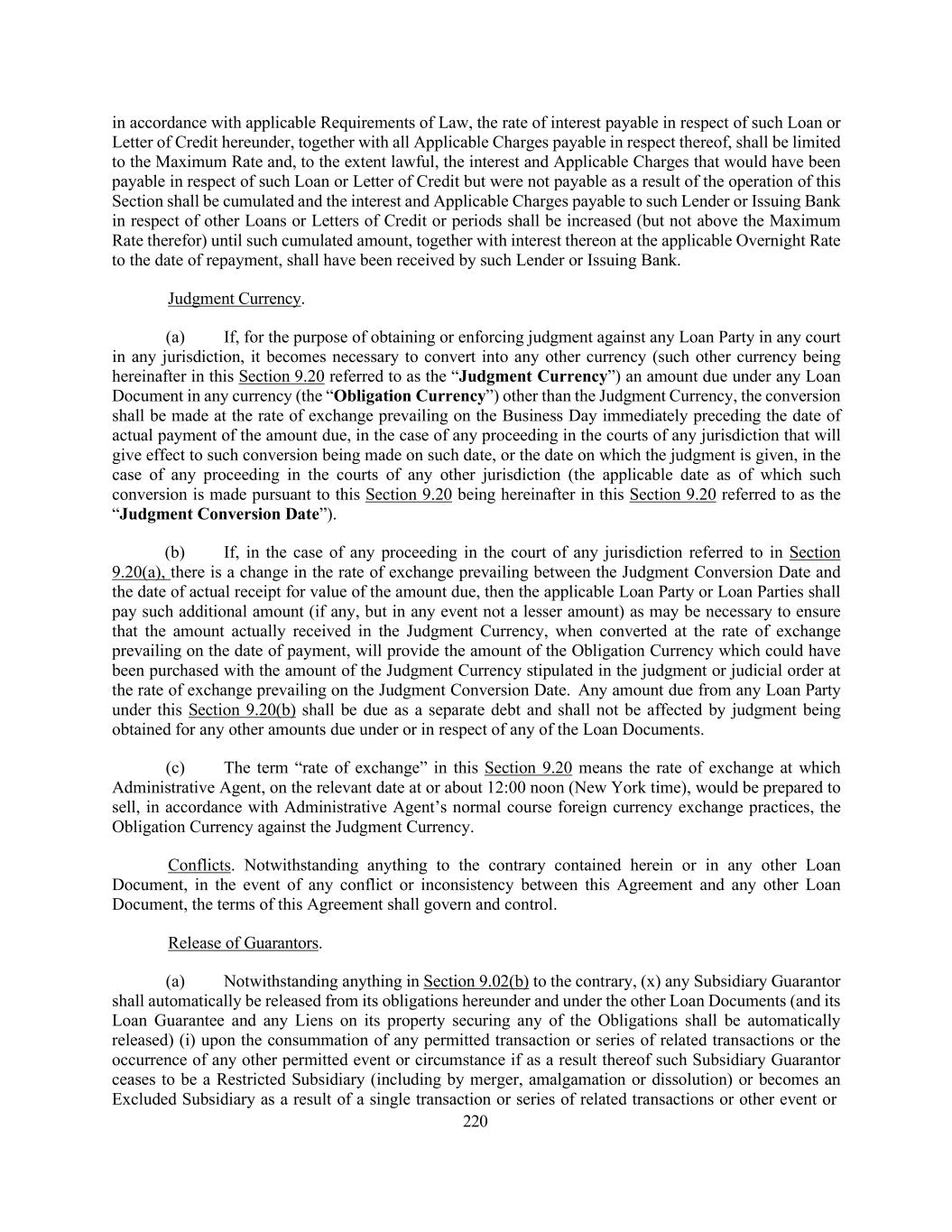 220 in accordance with applicable Requirements of Law, the rate of interest payable in respect of such Loan or Letter of Credit hereunder, together with all Applicable Charges payable in respect thereof, shall be limited to the Maximum Rate and, to the extent lawful, the interest and Applicable Charges that would have been payable in respect of such Loan or Letter of Credit but were not payable as a result of the operation of this Section shall be cumulated and the interest and Applicable Charges payable to such Lender or Issuing Bank in respect of other Loans or Letters of Credit or periods shall be increased (but not above the Maximum Rate therefor) until such cumulated amount, together with interest thereon at the applicable Overnight Rate to the date of repayment, shall have been received by such Lender or Issuing Bank. Judgment Currency. (a) If, for the purpose of obtaining or enforcing judgment against any Loan Party in any court in any jurisdiction, it becomes necessary to convert into any other currency (such other currency being hereinafter in this Section 9.20 referred to as the “Judgment Currency”) an amount due under any Loan Document in any currency (the “Obligation Currency”) other than the Judgment Currency, the conversion shall be made at the rate of exchange prevailing on the Business Day immediately preceding the date of actual payment of the amount due, in the case of any proceeding in the courts of any jurisdiction that will give effect to such conversion being made on such date, or the date on which the judgment is given, in the case of any proceeding in the courts of any other jurisdiction (the applicable date as of which such conversion is made pursuant to this Section 9.20 being hereinafter in this Section 9.20 referred to as the “Judgment Conversion Date”). (b) If, in the case of any proceeding in the court of any jurisdiction referred to in Section 9.20(a), there is a change in the rate of exchange prevailing between the Judgment Conversion Date and the date of actual receipt for value of the amount due, then the applicable Loan Party or Loan Parties shall pay such additional amount (if any, but in any event not a lesser amount) as may be necessary to ensure that the amount actually received in the Judgment Currency, when converted at the rate of exchange prevailing on the date of payment, will provide the amount of the Obligation Currency which could have been purchased with the amount of the Judgment Currency stipulated in the judgment or judicial order at the rate of exchange prevailing on the Judgment Conversion Date. Any amount due from any Loan Party under this Section 9.20(b) shall be due as a separate debt and shall not be affected by judgment being obtained for any other amounts due under or in respect of any of the Loan Documents. (c) The term “rate of exchange” in this Section 9.20 means the rate of exchange at which Administrative Agent, on the relevant date at or about 12:00 noon (New York time), would be prepared to sell, in accordance with Administrative Agent’s normal course foreign currency exchange practices, the Obligation Currency against the Judgment Currency. Conflicts. Notwithstanding anything to the contrary contained herein or in any other Loan Document, in the event of any conflict or inconsistency between this Agreement and any other Loan Document, the terms of this Agreement shall govern and control. Release of Guarantors. (a) Notwithstanding anything in Section 9.02(b) to the contrary, (x) any Subsidiary Guarantor shall automatically be released from its obligations hereunder and under the other Loan Documents (and its Loan Guarantee and any Liens on its property securing any of the Obligations shall be automatically released) (i) upon the consummation of any permitted transaction or series of related transactions or the occurrence of any other permitted event or circumstance if as a result thereof such Subsidiary Guarantor ceases to be a Restricted Subsidiary (including by merger, amalgamation or dissolution) or becomes an Excluded Subsidiary as a result of a single transaction or series of related transactions or other event or