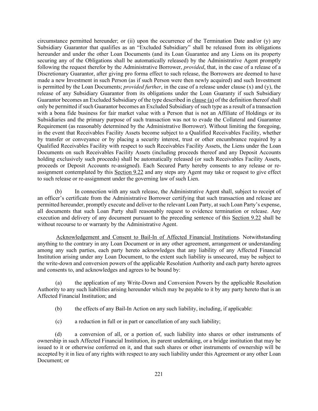 221 circumstance permitted hereunder; or (ii) upon the occurrence of the Termination Date and/or (y) any Subsidiary Guarantor that qualifies as an “Excluded Subsidiary” shall be released from its obligations hereunder and under the other Loan Documents (and its Loan Guarantee and any Liens on its property securing any of the Obligations shall be automatically released) by the Administrative Agent promptly following the request therefor by the Administrative Borrower, provided, that, in the case of a release of a Discretionary Guarantor, after giving pro forma effect to such release, the Borrowers are deemed to have made a new Investment in such Person (as if such Person were then newly acquired) and such Investment is permitted by the Loan Documents; provided further, in the case of a release under clause (x) and (y), the release of any Subsidiary Guarantor from its obligations under the Loan Guaranty if such Subsidiary Guarantor becomes an Excluded Subsidiary of the type described in clause (a) of the definition thereof shall only be permitted if such Guarantor becomes an Excluded Subsidiary of such type as a result of a transaction with a bona fide business for fair market value with a Person that is not an Affiliate of Holdings or its Subsidiaries and the primary purpose of such transaction was not to evade the Collateral and Guarantee Requirement (as reasonably determined by the Administrative Borrower). Without limiting the foregoing, in the event that Receivables Facility Assets become subject to a Qualified Receivables Facility, whether by transfer or conveyance or by placing a security interest, trust or other encumbrance required by a Qualified Receivables Facility with respect to such Receivables Facility Assets, the Liens under the Loan Documents on such Receivables Facility Assets (including proceeds thereof and any Deposit Accounts holding exclusively such proceeds) shall be automatically released (or such Receivables Facility Assets, proceeds or Deposit Accounts re-assigned). Each Secured Party hereby consents to any release or re- assignment contemplated by this Section 9.22 and any steps any Agent may take or request to give effect to such release or re-assignment under the governing law of such Lien. (b) In connection with any such release, the Administrative Agent shall, subject to receipt of an officer’s certificate from the Administrative Borrower certifying that such transaction and release are permitted hereunder, promptly execute and deliver to the relevant Loan Party, at such Loan Party’s expense, all documents that such Loan Party shall reasonably request to evidence termination or release. Any execution and delivery of any document pursuant to the preceding sentence of this Section 9.22 shall be without recourse to or warranty by the Administrative Agent. Acknowledgement and Consent to Bail-In of Affected Financial Institutions. Notwithstanding anything to the contrary in any Loan Document or in any other agreement, arrangement or understanding among any such parties, each party hereto acknowledges that any liability of any Affected Financial Institution arising under any Loan Document, to the extent such liability is unsecured, may be subject to the write-down and conversion powers of the applicable Resolution Authority and each party hereto agrees and consents to, and acknowledges and agrees to be bound by: (a) the application of any Write-Down and Conversion Powers by the applicable Resolution Authority to any such liabilities arising hereunder which may be payable to it by any party hereto that is an Affected Financial Institution; and (b) the effects of any Bail-In Action on any such liability, including, if applicable: (c) a reduction in full or in part or cancellation of any such liability; (d) a conversion of all, or a portion of, such liability into shares or other instruments of ownership in such Affected Financial Institution, its parent undertaking, or a bridge institution that may be issued to it or otherwise conferred on it, and that such shares or other instruments of ownership will be accepted by it in lieu of any rights with respect to any such liability under this Agreement or any other Loan Document; or