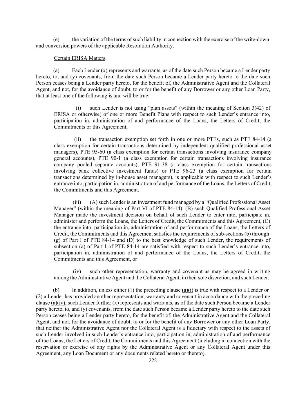 222 (e) the variation of the terms of such liability in connection with the exercise of the write-down and conversion powers of the applicable Resolution Authority. Certain ERISA Matters. (a) Each Lender (x) represents and warrants, as of the date such Person became a Lender party hereto, to, and (y) covenants, from the date such Person became a Lender party hereto to the date such Person ceases being a Lender party hereto, for the benefit of, the Administrative Agent and the Collateral Agent, and not, for the avoidance of doubt, to or for the benefit of any Borrower or any other Loan Party, that at least one of the following is and will be true: (i) such Lender is not using “plan assets” (within the meaning of Section 3(42) of ERISA or otherwise) of one or more Benefit Plans with respect to such Lender’s entrance into, participation in, administration of and performance of the Loans, the Letters of Credit, the Commitments or this Agreement, (ii) the transaction exemption set forth in one or more PTEs, such as PTE 84-14 (a class exemption for certain transactions determined by independent qualified professional asset managers), PTE 95-60 (a class exemption for certain transactions involving insurance company general accounts), PTE 90-1 (a class exemption for certain transactions involving insurance company pooled separate accounts), PTE 91-38 (a class exemption for certain transactions involving bank collective investment funds) or PTE 96-23 (a class exemption for certain transactions determined by in-house asset managers), is applicable with respect to such Lender’s entrance into, participation in, administration of and performance of the Loans, the Letters of Credit, the Commitments and this Agreement, (iii) (A) such Lender is an investment fund managed by a “Qualified Professional Asset Manager” (within the meaning of Part VI of PTE 84-14), (B) such Qualified Professional Asset Manager made the investment decision on behalf of such Lender to enter into, participate in, administer and perform the Loans, the Letters of Credit, the Commitments and this Agreement, (C) the entrance into, participation in, administration of and performance of the Loans, the Letters of Credit, the Commitments and this Agreement satisfies the requirements of sub-sections (b) through (g) of Part I of PTE 84-14 and (D) to the best knowledge of such Lender, the requirements of subsection (a) of Part I of PTE 84-14 are satisfied with respect to such Lender’s entrance into, participation in, administration of and performance of the Loans, the Letters of Credit, the Commitments and this Agreement, or (iv) such other representation, warranty and covenant as may be agreed in writing among the Administrative Agent and the Collateral Agent, in their sole discretion, and such Lender. (b) In addition, unless either (1) the preceding clause (a)(i) is true with respect to a Lender or (2) a Lender has provided another representation, warranty and covenant in accordance with the preceding clause (a)(iv), such Lender further (x) represents and warrants, as of the date such Person became a Lender party hereto, to, and (y) covenants, from the date such Person became a Lender party hereto to the date such Person ceases being a Lender party hereto, for the benefit of, the Administrative Agent and the Collateral Agent, and not, for the avoidance of doubt, to or for the benefit of any Borrower or any other Loan Party, that neither the Administrative Agent nor the Collateral Agent is a fiduciary with respect to the assets of such Lender involved in such Lender’s entrance into, participation in, administration of and performance of the Loans, the Letters of Credit, the Commitments and this Agreement (including in connection with the reservation or exercise of any rights by the Administrative Agent or any Collateral Agent under this Agreement, any Loan Document or any documents related hereto or thereto).