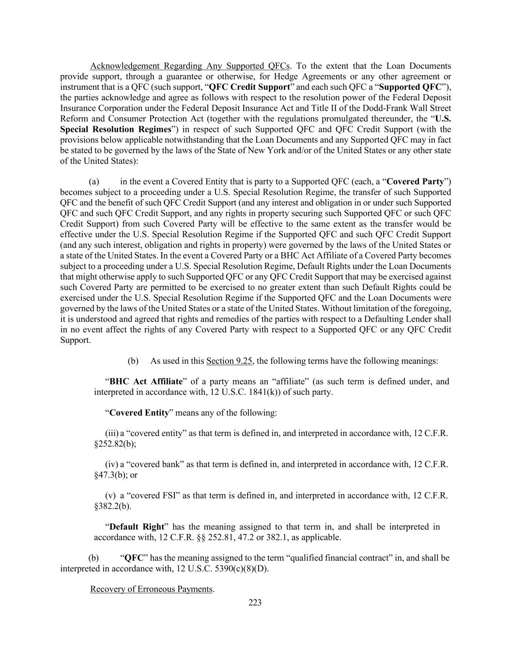 223 Acknowledgement Regarding Any Supported QFCs. To the extent that the Loan Documents provide support, through a guarantee or otherwise, for Hedge Agreements or any other agreement or instrument that is a QFC (such support, “QFC Credit Support” and each such QFC a “Supported QFC”), the parties acknowledge and agree as follows with respect to the resolution power of the Federal Deposit Insurance Corporation under the Federal Deposit Insurance Act and Title II of the Dodd-Frank Wall Street Reform and Consumer Protection Act (together with the regulations promulgated thereunder, the “U.S. Special Resolution Regimes”) in respect of such Supported QFC and QFC Credit Support (with the provisions below applicable notwithstanding that the Loan Documents and any Supported QFC may in fact be stated to be governed by the laws of the State of New York and/or of the United States or any other state of the United States): (a) in the event a Covered Entity that is party to a Supported QFC (each, a “Covered Party”) becomes subject to a proceeding under a U.S. Special Resolution Regime, the transfer of such Supported QFC and the benefit of such QFC Credit Support (and any interest and obligation in or under such Supported QFC and such QFC Credit Support, and any rights in property securing such Supported QFC or such QFC Credit Support) from such Covered Party will be effective to the same extent as the transfer would be effective under the U.S. Special Resolution Regime if the Supported QFC and such QFC Credit Support (and any such interest, obligation and rights in property) were governed by the laws of the United States or a state of the United States. In the event a Covered Party or a BHC Act Affiliate of a Covered Party becomes subject to a proceeding under a U.S. Special Resolution Regime, Default Rights under the Loan Documents that might otherwise apply to such Supported QFC or any QFC Credit Support that may be exercised against such Covered Party are permitted to be exercised to no greater extent than such Default Rights could be exercised under the U.S. Special Resolution Regime if the Supported QFC and the Loan Documents were governed by the laws of the United States or a state of the United States. Without limitation of the foregoing, it is understood and agreed that rights and remedies of the parties with respect to a Defaulting Lender shall in no event affect the rights of any Covered Party with respect to a Supported QFC or any QFC Credit Support. (b) As used in this Section 9.25, the following terms have the following meanings: “BHC Act Affiliate” of a party means an “affiliate” (as such term is defined under, and interpreted in accordance with, 12 U.S.C. 1841(k)) of such party. “Covered Entity” means any of the following: (iii) a “covered entity” as that term is defined in, and interpreted in accordance with, 12 C.F.R. §252.82(b); (iv) a “covered bank” as that term is defined in, and interpreted in accordance with, 12 C.F.R. §47.3(b); or (v) a “covered FSI” as that term is defined in, and interpreted in accordance with, 12 C.F.R. §382.2(b). “Default Right” has the meaning assigned to that term in, and shall be interpreted in accordance with, 12 C.F.R. §§ 252.81, 47.2 or 382.1, as applicable. (b) “QFC” has the meaning assigned to the term “qualified financial contract” in, and shall be interpreted in accordance with, 12 U.S.C. 5390(c)(8)(D). Recovery of Erroneous Payments.