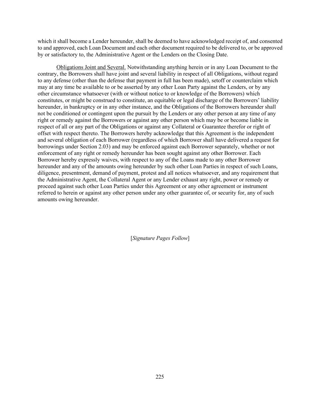 225 which it shall become a Lender hereunder, shall be deemed to have acknowledged receipt of, and consented to and approved, each Loan Document and each other document required to be delivered to, or be approved by or satisfactory to, the Administrative Agent or the Lenders on the Closing Date. Obligations Joint and Several. Notwithstanding anything herein or in any Loan Document to the contrary, the Borrowers shall have joint and several liability in respect of all Obligations, without regard to any defense (other than the defense that payment in full has been made), setoff or counterclaim which may at any time be available to or be asserted by any other Loan Party against the Lenders, or by any other circumstance whatsoever (with or without notice to or knowledge of the Borrowers) which constitutes, or might be construed to constitute, an equitable or legal discharge of the Borrowers’ liability hereunder, in bankruptcy or in any other instance, and the Obligations of the Borrowers hereunder shall not be conditioned or contingent upon the pursuit by the Lenders or any other person at any time of any right or remedy against the Borrowers or against any other person which may be or become liable in respect of all or any part of the Obligations or against any Collateral or Guarantee therefor or right of offset with respect thereto. The Borrowers hereby acknowledge that this Agreement is the independent and several obligation of each Borrower (regardless of which Borrower shall have delivered a request for borrowings under Section 2.03) and may be enforced against each Borrower separately, whether or not enforcement of any right or remedy hereunder has been sought against any other Borrower. Each Borrower hereby expressly waives, with respect to any of the Loans made to any other Borrower hereunder and any of the amounts owing hereunder by such other Loan Parties in respect of such Loans, diligence, presentment, demand of payment, protest and all notices whatsoever, and any requirement that the Administrative Agent, the Collateral Agent or any Lender exhaust any right, power or remedy or proceed against such other Loan Parties under this Agreement or any other agreement or instrument referred to herein or against any other person under any other guarantee of, or security for, any of such amounts owing hereunder. [Signature Pages Follow]