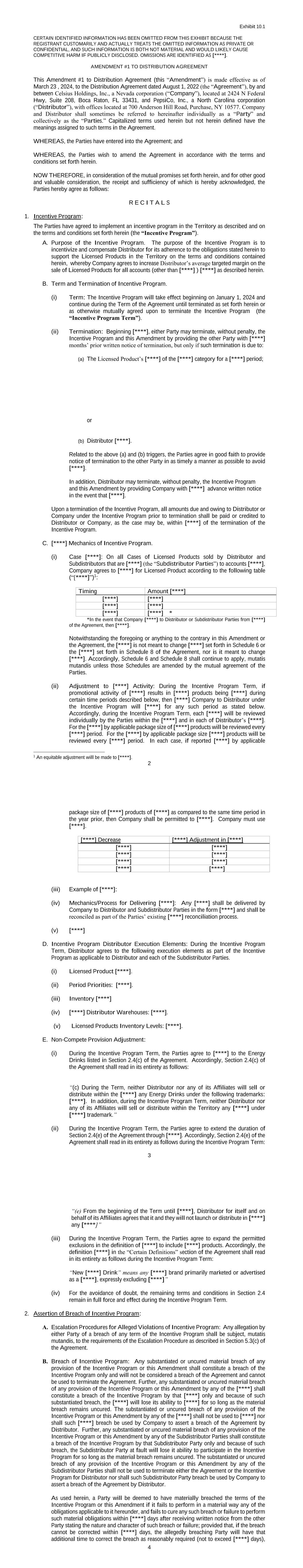 Exhibit 10.1 CERTAIN IDENTIFIED INFORMATION HAS BEEN OMITTED FROM THIS EXHIBIT BECAUSE THE REGISTRANT CUSTOMARILY AND ACTUALLY TREATS THE OMITTED INFORMATION AS PRIVATE OR CONFIDENTIAL, AND SUCH INFORMATION IS BOTH NOT MATERIAL AND WOULD LIKELY CAUSE COMPETITIVE HARM IF PUBLICLY DISCLOSED. OMISSIONS ARE IDENTIFIED AS [****]. AMENDMENT #1 TO DISTRIBUTION AGREEMENT This Amendment #1 to Distribution Agreement (this “Amendment”) is made effective as of March 23 , 2024, to the Distribution Agreement dated August 1, 2022 (the “Agreement”), by and between Celsius Holdings, Inc., a Nevada corporation (“Company”), located at 2424 N Federal Hwy, Suite 208, Boca Raton, FL 33431, and PepsiCo, Inc., a North Carolina corporation (“Distributor”), with offices located at 700 Anderson Hill Road, Purchase, NY 10577. Company and Distributor shall sometimes be referred to hereinafter individually as a “Party” and collectively as the “Parties.” Capitalized terms used herein but not herein defined have the meanings assigned to such terms in the Agreement. WHEREAS, the Parties have entered into the Agreement; and WHEREAS, the Parties wish to amend the Agreement in accordance with the terms and conditions set forth herein. NOW THEREFORE, in consideration of the mutual promises set forth herein, and for other good and valuable consideration, the receipt and sufficiency of which is hereby acknowledged, the Parties hereby agree as follows: R E C I T A L S 1. Incentive Program: The Parties have agreed to implement an incentive program in the Territory as described and on the terms and conditions set forth herein (the “Incentive Program”). A. Purpose of the Incentive Program. The purpose of the Incentive Program is to incentivize and compensate Distributor for its adherence to the obligations stated herein to support the Licensed Products in the Territory on the terms and conditions contained herein, whereby Company agrees to increase Distributor’s average targeted margin on the sale of Licensed Products for all accounts (other than [****] ) [****] as described herein. B. Term and Termination of Incentive Program. (i) Term: The Incentive Program will take effect beginning on January 1, 2024 and continue during the Term of the Agreement until terminated as set forth herein or as otherwise mutually agreed upon to terminate the Incentive Program (the “Incentive Program Term”). (ii) Termination: Beginning [****], either Party may terminate, without penalty, the Incentive Program and this Amendment by providing the other Party with [****] months’ prior written notice of termination, but only if such termination is due to: (a) The Licensed Product’s [****] of the [****] category for a [****] period; 2 or (b) Distributor [****]. Related to the above (a) and (b) triggers, the Parties agree in good faith to provide notice of termination to the other Party in as timely a manner as possible to avoid [****]. In addition, Distributor may terminate, without penalty, the Incentive Program and this Amendment by providing Company with [****] advance written notice in the event that [****]. Upon a termination of the Incentive Program, all amounts due and owing to Distributor or Company under the Incentive Program prior to termination shall be paid or credited to Distributor or Company, as the case may be, within [****] of the termination of the Incentive Program. C. [****] Mechanics of Incentive Program. (i) Case [****]: On all Cases of Licensed Products sold by Distributor and Subdistributors that are [****] (the “Subdistributor Parties”) to accounts [****], Company agrees to [****] for Licensed Product according to the following table (“[****]”)1: Timing Amount [****] [****] [****] [****] [****] [****] [****] * *In the event that Company [****] to Distributor or Subdistributor Parties from [****] of the Agreement, then [****]. Notwithstanding the foregoing or anything to the contrary in this Amendment or the Agreement, the [****] is not meant to change [****] set forth in Schedule 6 or the [****] set forth in Schedule 8 of the Agreement, nor is it meant to change [****]. Accordingly, Schedule 6 and Schedule 8 shall continue to apply, mutatis mutandis unless those Schedules are amended by the mutual agreement of the Parties. (ii) Adjustment to [****] Activity: During the Incentive Program Term, if promotional activity of [****] results in [****] products being [****] during certain time periods described below, then [****] Company to Distributor under the Incentive Program will [****] for any such period as stated below. Accordingly, during the Incentive Program Term, each [****] will be reviewed individually by the Parties within the [****] and in each of Distributor’s [****]. For the [****] by applicable package size of [****] products will be reviewed every [****] period. For the [****] by applicable package size [****] products will be reviewed every [****] period. In each case, if reported [****] by applicable 1 An equitable adjustment will be made to [****]. 3 package size of [****] products of [****] as compared to the same time period in the year prior, then Company shall be permitted to [****]. Company must use [****]. [****] Decrease [****] Adjustment in [****] [****] [****] [****] [****] [****] [****] [****] [****] (iii) Example of [****]: (iv) Mechanics/Process for Delivering [****]: Any [****] shall be delivered by Company to Distributor and Subdistributor Parties in the form [****] and shall be reconciled as part of the Parties’ existing [****] reconciliation process. (v) [****] D. Incentive Program Distributor Execution Elements: During the Incentive Program Term, Distributor agrees to the following execution elements as part of the Incentive Program as applicable to Distributor and each of the Subdistributor Parties. (i) Licensed Product [****]. (ii) Period Priorities: [****]. (iii) Inventory [****] (iv) [****] Distributor Warehouses: [****]. (v) Licensed Products Inv