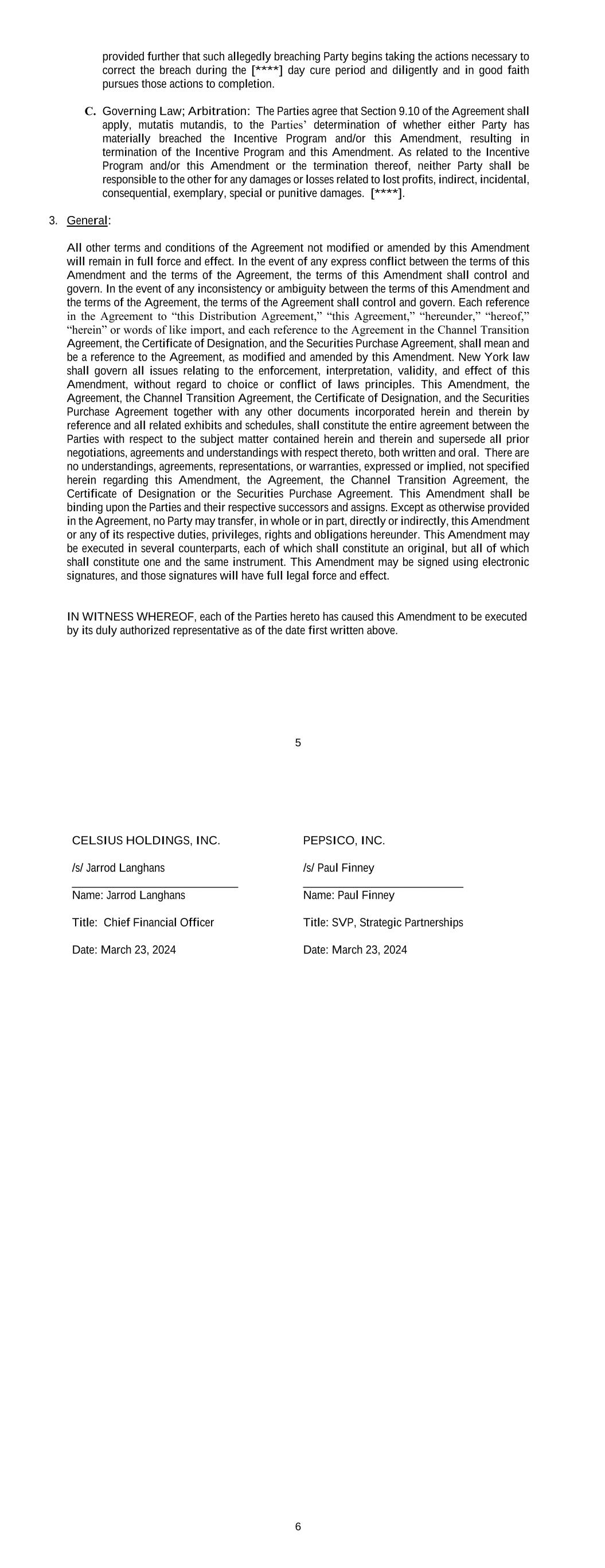 5 provided further that such allegedly breaching Party begins taking the actions necessary to correct the breach during the [****] day cure period and diligently and in good faith pursues those actions to completion. C. Governing Law; Arbitration: The Parties agree that Section 9.10 of the Agreement shall apply, mutatis mutandis, to the Parties’ determination of whether either Party has materially breached the Incentive Program and/or this Amendment, resulting in termination of the Incentive Program and this Amendment. As related to the Incentive Program and/or this Amendment or the termination thereof, neither Party shall be responsible to the other for any damages or losses related to lost profits, indirect, incidental, consequential, exemplary, special or punitive damages. [****]. 3. General: All other terms and conditions of the Agreement not modified or amended by this Amendment will remain in full force and effect. In the event of any express conflict between the terms of this Amendment and the terms of the Agreement, the terms of this Amendment shall control and govern. In the event of any inconsistency or ambiguity between the terms of this Amendment and the terms of the Agreement, the terms of the Agreement shall control and govern. Each reference in the Agreement to “this Distribution Agreement,” “this Agreement,” “hereunder,” “hereof,” “herein” or words of like import, and each reference to the Agreement in the Channel Transition Agreement, the Certificate of Designation, and the Securities Purchase Agreement, shall mean and be a reference to the Agreement, as modified and amended by this Amendment. New York law shall govern all issues relating to the enforcement, interpretation, validity, and effect of this Amendment, without regard to choice or conflict of laws principles. This Amendment, the Agreement, the Channel Transition Agreement, the Certificate of Designation, and the Securities Purchase Agreement together with any other documents incorporated herein and therein by reference and all related exhibits and schedules, shall constitute the entire agreement between the Parties with respect to the subject matter contained herein and therein and supersede all prior negotiations, agreements and understandings with respect thereto, both written and oral. There are no understandings, agreements, representations, or warranties, expressed or implied, not specified herein regarding this Amendment, the Agreement, the Channel Transition Agreement, the Certificate of Designation or the Securities Purchase Agreement. This Amendment shall be binding upon the Parties and their respective successors and assigns. Except as otherwise provided in the Agreement, no Party may transfer, in whole or in part, directly or indirectly, this Amendment or any of its respective duties, privileges, rights and obligations hereunder. This Amendment may be executed in several counterparts, each of which shall constitute an original, but all of which shall constitute one and the same instrument. This Amendment may be signed using electronic signatures, and those signatures will have full legal force and effect. IN WITNESS WHEREOF, each of the Parties hereto has caused this Amendment to be executed by its duly authorized representative as of the date first written above. 6 CELSIUS HOLDINGS, INC. /s/ Jarrod Langhans ____________________________ Name: Jarrod Langhans Title: Chief Financial Officer Date: March 23, 2024 PEPSICO, INC. /s/ Paul Finney ___________________________ Name: Paul Finney Title: SVP, Strategic Partnerships Date: March 23, 2024