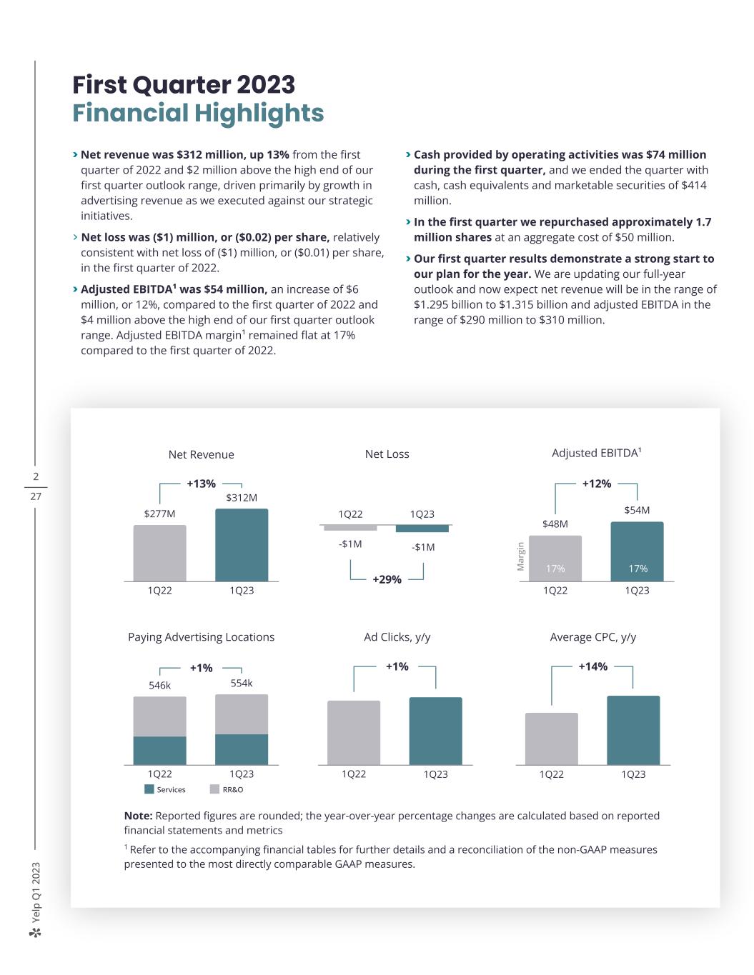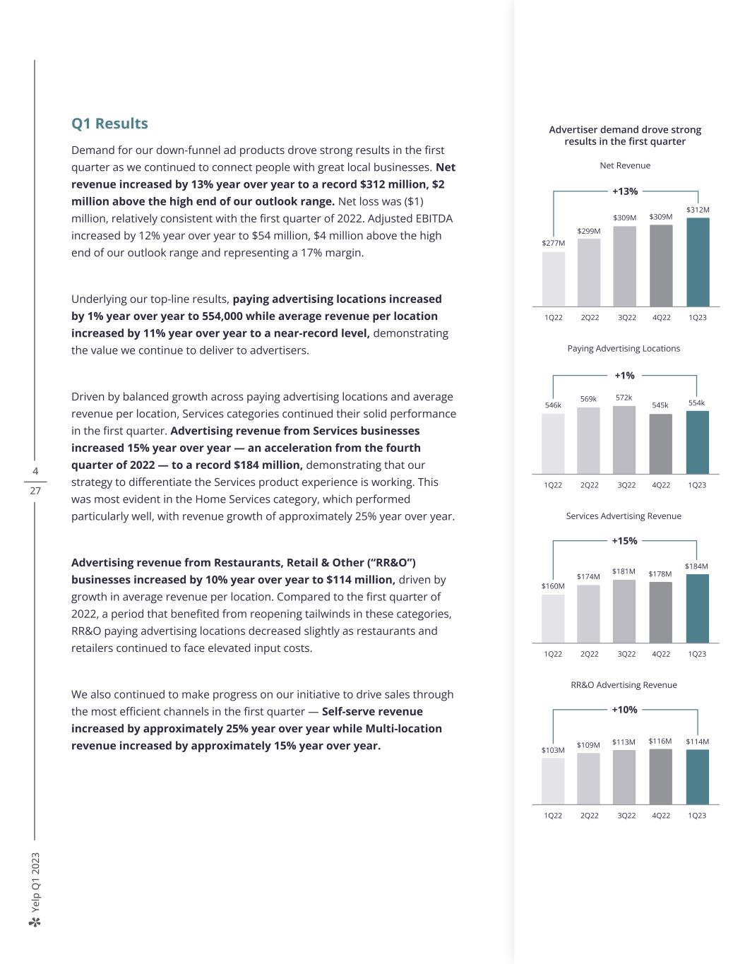 Ye lp Q 1 20 23 4 27 Q1 Results Demand for our down-funnel ad products drove strong results in the first quarter as we continued to connect people with great local businesses. Net revenue increased by 13% year over year to a record $312 million, $2 million above the high end of our outlook range. Net loss was ($1) million, relatively consistent with the first quarter of 2022. Adjusted EBITDA increased by 12% year over year to $54 million, $4 million above the high end of our outlook range and representing a 17% margin. Underlying our top-line results, paying advertising locations increased by 1% year over year to 554,000 while average revenue per location increased by 11% year over year to a near-record level, demonstrating the value we continue to deliver to advertisers. Driven by balanced growth across paying advertising locations and average revenue per location, Services categories continued their solid performance in the first quarter. Advertising revenue from Services businesses increased 15% year over year — an acceleration from the fourth quarter of 2022 — to a record $184 million, demonstrating that our strategy to differentiate the Services product experience is working. This was most evident in the Home Services category, which performed particularly well, with revenue growth of approximately 25% year over year. Advertising revenue from Restaurants, Retail & Other (“RR&O”) businesses increased by 10% year over year to $114 million, driven by growth in average revenue per location. Compared to the first quarter of 2022, a period that benefited from reopening tailwinds in these categories, RR&O paying advertising locations decreased slightly as restaurants and retailers continued to face elevated input costs. We also continued to make progress on our initiative to drive sales through the most efficient channels in the first quarter — Self-serve revenue increased by approximately 25% year over year while Multi-location revenue increased by approximately 15% year over year. Paying Advertising Locations +1% 546k 1Q22 2Q22 3Q22 4Q22 1Q23 554k569k 572k 545k Services Advertising Revenue +15% $160M 1Q22 2Q22 3Q22 4Q22 1Q23 $184M $174M $181M $178M RR&O Advertising Revenue +10% $103M 1Q22 2Q22 3Q22 4Q22 1Q23 $114M$109M $113M $116M Advertiser demand drove strong results in the first quarter Net Revenue +13% $277M 1Q22 2Q22 3Q22 4Q22 1Q23 $312M $299M $309M $309M