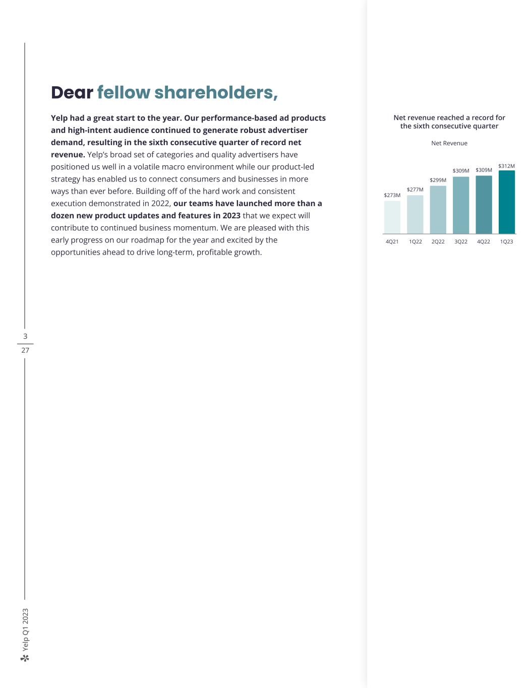 Ye lp Q 1 20 23 3 27 Dear fellow shareholders, Yelp had a great start to the year. Our performance-based ad products and high-intent audience continued to generate robust advertiser demand, resulting in the sixth consecutive quarter of record net revenue. Yelp’s broad set of categories and quality advertisers have positioned us well in a volatile macro environment while our product-led strategy has enabled us to connect consumers and businesses in more ways than ever before. Building off of the hard work and consistent execution demonstrated in 2022, our teams have launched more than a dozen new product updates and features in 2023 that we expect will contribute to continued business momentum. We are pleased with this early progress on our roadmap for the year and excited by the opportunities ahead to drive long-term, profitable growth. Net revenue reached a record for the sixth consecutive quarter Net Revenue 4Q21 1Q22 2Q22 4Q223Q22 1Q23 $312M $309M$309M $299M $277M $273M