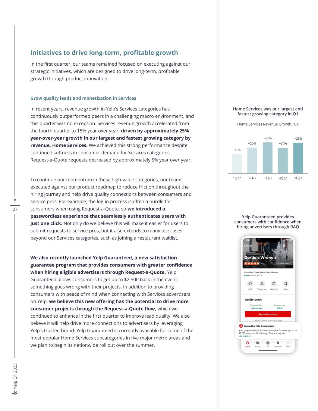 Ye lp Q 1 20 23 5 27 Initiatives to drive long-term, profitable growth In the first quarter, our teams remained focused on executing against our strategic initiatives, which are designed to drive long-term, profitable growth through product innovation. Grow quality leads and monetization in Services In recent years, revenue growth in Yelp’s Services categories has continuously outperformed peers in a challenging macro environment, and this quarter was no exception. Services revenue growth accelerated from the fourth quarter to 15% year over year, driven by approximately 25% year-over-year growth in our largest and fastest growing category by revenue, Home Services. We achieved this strong performance despite continued softness in consumer demand for Services categories — Request-a-Quote requests decreased by approximately 5% year over year. To continue our momentum in these high-value categories, our teams executed against our product roadmap to reduce friction throughout the hiring journey and help drive quality connections between consumers and service pros. For example, the log-in process is often a hurdle for consumers when using Request-a-Quote, so we introduced a passwordless experience that seamlessly authenticates users with just one click. Not only do we believe this will make it easier for users to submit requests to service pros, but it also extends to many use cases beyond our Services categories, such as joining a restaurant waitlist. We also recently launched Yelp Guaranteed, a new satisfaction guarantee program that provides consumers with greater confidence when hiring eligible advertisers through Request-a-Quote. Yelp Guaranteed allows consumers to get up to $2,500 back in the event something goes wrong with their projects. In addition to providing consumers with peace of mind when connecting with Services advertisers on Yelp, we believe this new offering has the potential to drive more consumer projects through the Request-a-Quote flow, which we continued to enhance in the first quarter to improve lead quality. We also believe it will help drive more connections to advertisers by leveraging Yelp’s trusted brand. Yelp Guaranteed is currently available for some of the most popular Home Services subcategories in five major metro areas and we plan to begin its nationwide roll out over the summer. Home Services was our largest and fastest growing category in Q1 Home Services Revenue Growth, Y/Y 1Q22 2Q22 3Q22 1Q234Q22 ~15% ~20% ~25% ~20% ~25% Yelp Guaranteed provides consumers with confidence when hiring advertisers through RAQ ~25% 3Q21 3Q22 +15% Local, Auto, Professional, Pets, Real Estate, Financial and Event Services Home Services Home Services revenue growth accelerated to approximately 25% y/y Services Revenue Strength in Home Services drove revenue growth of 25% y/y Home Services Revenue +25% 1Q22 1Q23