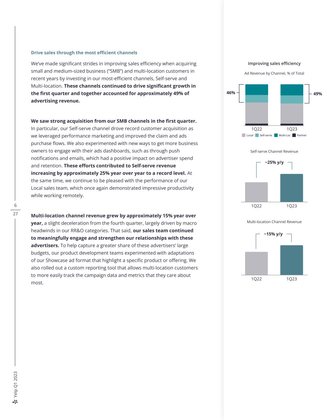 Ye lp Q 1 20 23 6 27 Drive sales through the most efficient channels We’ve made significant strides in improving sales efficiency when acquiring small and medium-sized business (“SMB”) and multi-location customers in recent years by investing in our most-efficient channels, Self-serve and Multi-location. These channels continued to drive significant growth in the first quarter and together accounted for approximately 49% of advertising revenue. We saw strong acquisition from our SMB channels in the first quarter. In particular, our Self-serve channel drove record customer acquisition as we leveraged performance marketing and improved the claim and ads purchase flows. We also experimented with new ways to get more business owners to engage with their ads dashboards, such as through push notifications and emails, which had a positive impact on advertiser spend and retention. These efforts contributed to Self-serve revenue increasing by approximately 25% year over year to a record level. At the same time, we continue to be pleased with the performance of our Local sales team, which once again demonstrated impressive productivity while working remotely. Multi-location channel revenue grew by approximately 15% year over year, a slight deceleration from the fourth quarter, largely driven by macro headwinds in our RR&O categories. That said, our sales team continued to meaningfully engage and strengthen our relationships with these advertisers. To help capture a greater share of these advertisers’ large budgets, our product development teams experimented with adaptations of our Showcase ad format that highlight a specific product or offering. We also rolled out a custom reporting tool that allows multi-location customers to more easily track the campaign data and metrics that they care about most. Self-serve Channel Revenue ~25% y/y 1Q22 1Q23 1Q22 1Q23 Self-serveLocal Multi-Loc Partner 28%46% 49% Improving sales efficiency Ad Revenue by Channel, % of Total Multi-location Channel Revenue ~15% y/y 1Q22 1Q23