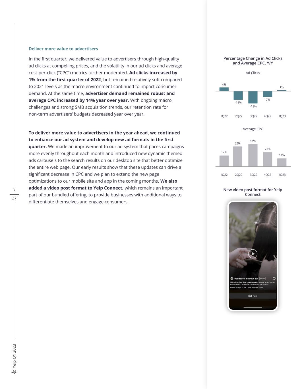 Ye lp Q 1 20 23 7 27 Deliver more value to advertisers In the first quarter, we delivered value to advertisers through high-quality ad clicks at compelling prices, and the volatility in our ad clicks and average cost-per-click (“CPC”) metrics further moderated. Ad clicks increased by 1% from the first quarter of 2022, but remained relatively soft compared to 2021 levels as the macro environment continued to impact consumer demand. At the same time, advertiser demand remained robust and average CPC increased by 14% year over year. With ongoing macro challenges and strong SMB acquisition trends, our retention rate for non-term advertisers’ budgets decreased year over year. To deliver more value to advertisers in the year ahead, we continued to enhance our ad system and develop new ad formats in the first quarter. We made an improvement to our ad system that paces campaigns more evenly throughout each month and introduced new dynamic themed ads carousels to the search results on our desktop site that better optimize the entire web page. Our early results show that these updates can drive a significant decrease in CPC and we plan to extend the new page optimizations to our mobile site and app in the coming months. We also added a video post format to Yelp Connect, which remains an important part of our bundled offering, to provide businesses with additional ways to differentiate themselves and engage consumers. Percentage Change in Ad Clicks and Average CPC, Y/Y Ad Clicks 4% 1Q22 2Q22 3Q22 4Q22 1Q23 1% -11% -15% -7% Average CPC 17% 1Q22 2Q22 3Q22 4Q22 1Q23 23% 32% 14% 36% New video post format for Yelp Connect
