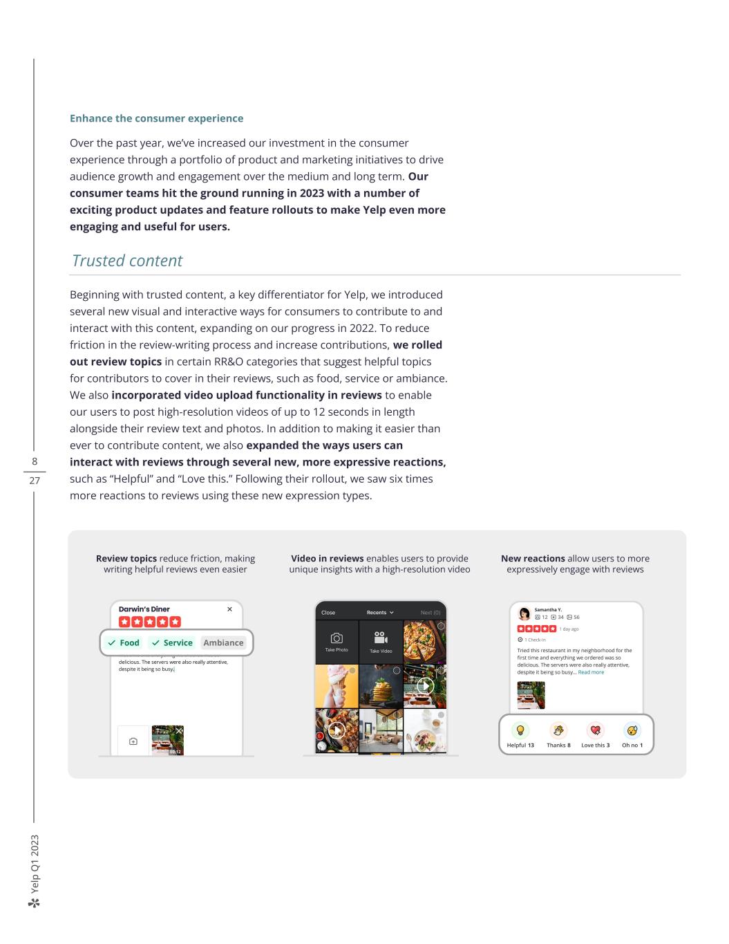 Ye lp Q 1 20 23 8 27 Enhance the consumer experience Over the past year, we’ve increased our investment in the consumer experience through a portfolio of product and marketing initiatives to drive audience growth and engagement over the medium and long term. Our consumer teams hit the ground running in 2023 with a number of exciting product updates and feature rollouts to make Yelp even more engaging and useful for users. Beginning with trusted content, a key differentiator for Yelp, we introduced several new visual and interactive ways for consumers to contribute to and interact with this content, expanding on our progress in 2022. To reduce friction in the review-writing process and increase contributions, we rolled out review topics in certain RR&O categories that suggest helpful topics for contributors to cover in their reviews, such as food, service or ambiance. We also incorporated video upload functionality in reviews to enable our users to post high-resolution videos of up to 12 seconds in length alongside their review text and photos. In addition to making it easier than ever to contribute content, we also expanded the ways users can interact with reviews through several new, more expressive reactions, such as “Helpful” and “Love this.” Following their rollout, we saw six times more reactions to reviews using these new expression types. Review topics reduce friction, making writing helpful reviews even easier Video in reviews enables users to provide unique insights with a high-resolution video New reactions allow users to more expressively engage with reviews Trusted content