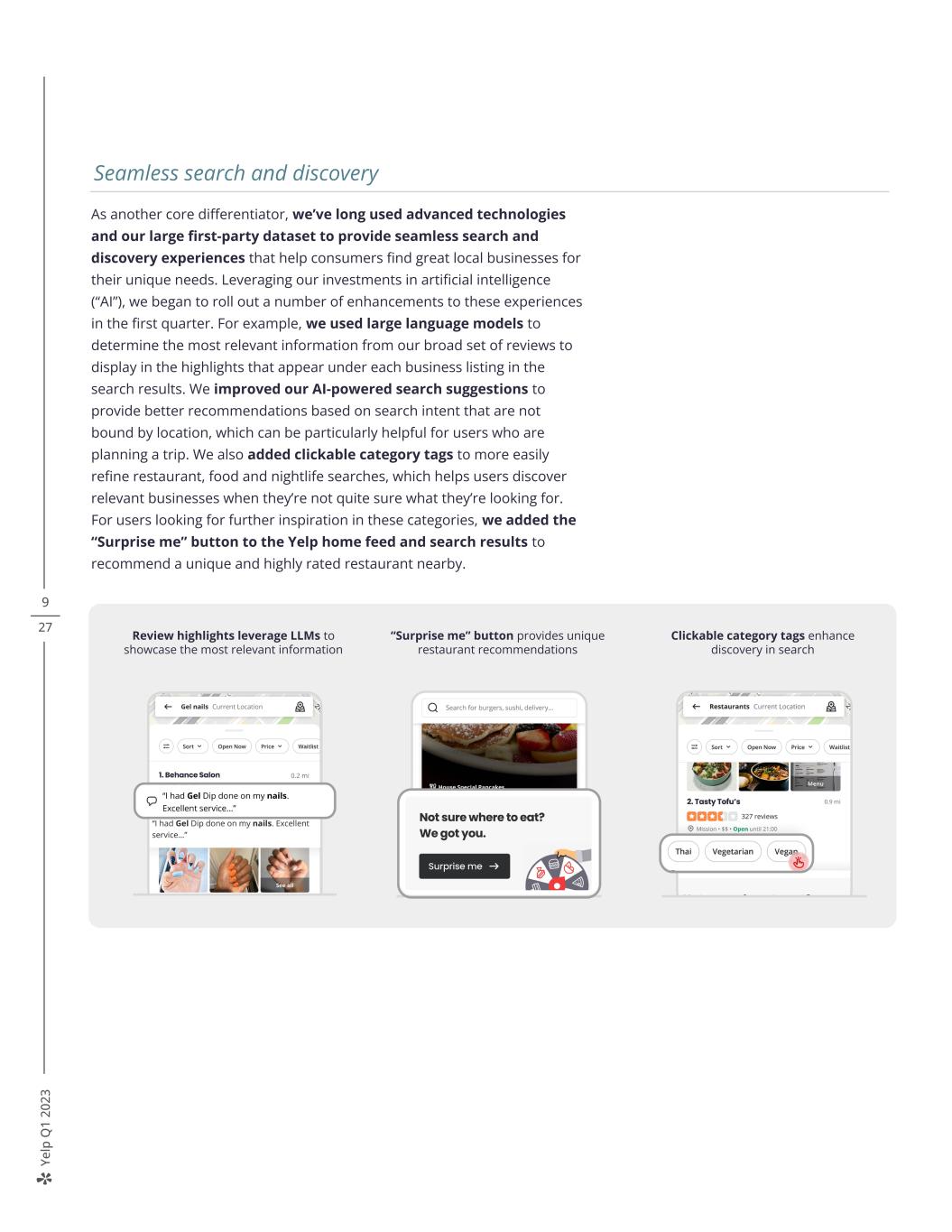 Ye lp Q 1 20 23 9 27 As another core differentiator, we’ve long used advanced technologies and our large first-party dataset to provide seamless search and discovery experiences that help consumers find great local businesses for their unique needs. Leveraging our investments in artificial intelligence (“AI”), we began to roll out a number of enhancements to these experiences in the first quarter. For example, we used large language models to determine the most relevant information from our broad set of reviews to display in the highlights that appear under each business listing in the search results. We improved our AI-powered search suggestions to provide better recommendations based on search intent that are not bound by location, which can be particularly helpful for users who are planning a trip. We also added clickable category tags to more easily refine restaurant, food and nightlife searches, which helps users discover relevant businesses when they’re not quite sure what they’re looking for. For users looking for further inspiration in these categories, we added the “Surprise me” button to the Yelp home feed and search results to recommend a unique and highly rated restaurant nearby. “Surprise me” button provides unique restaurant recommendations Clickable category tags enhance discovery in search Review highlights leverage LLMs to showcase the most relevant information Seamless search and discovery