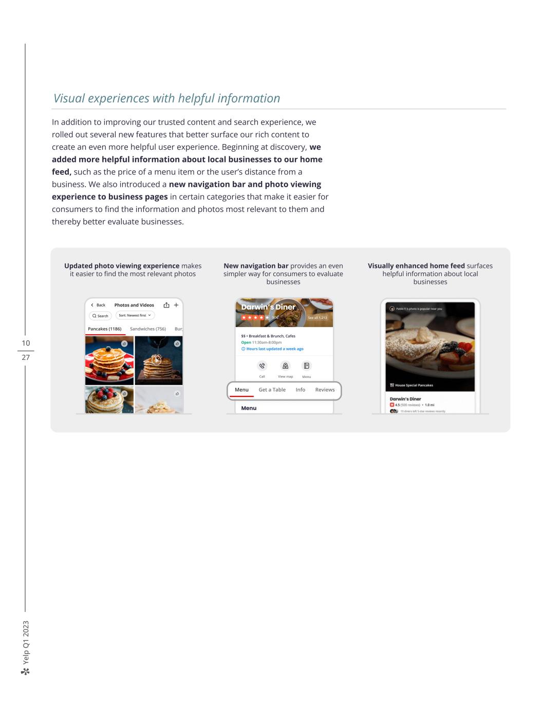 Ye lp Q 1 20 23 10 27 In addition to improving our trusted content and search experience, we rolled out several new features that better surface our rich content to create an even more helpful user experience. Beginning at discovery, we added more helpful information about local businesses to our home feed, such as the price of a menu item or the user’s distance from a business. We also introduced a new navigation bar and photo viewing experience to business pages in certain categories that make it easier for consumers to find the information and photos most relevant to them and thereby better evaluate businesses. Visual experiences with helpful information New navigation bar provides an even simpler way for consumers to evaluate businesses Visually enhanced home feed surfaces helpful information about local businesses Updated photo viewing experience makes it easier to find the most relevant photos