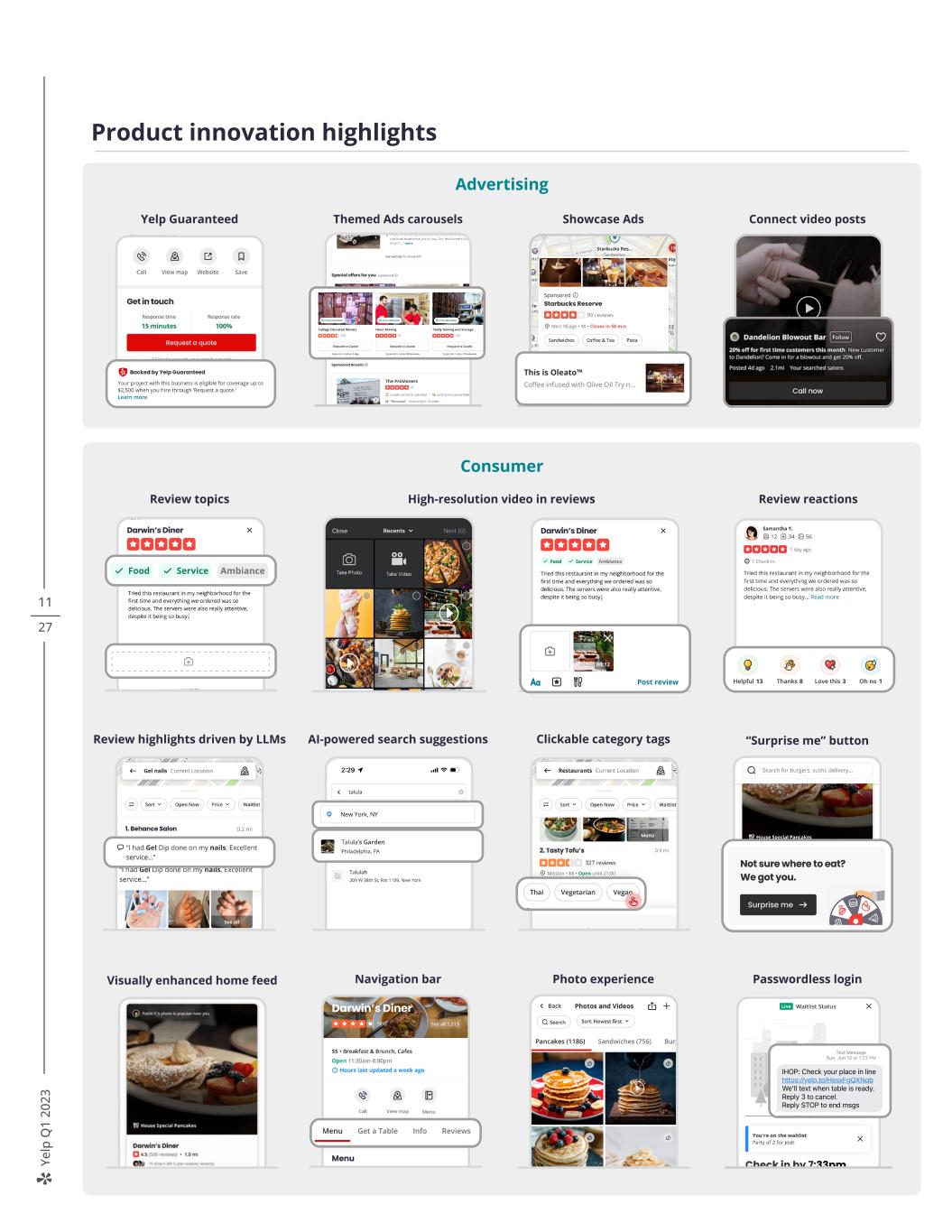 Ye lp Q 1 20 23 11 27 Product innovation highlights Yelp Guaranteed High-resolution video in reviews Passwordless login Connect video posts Review highlights driven by LLMs AI-powered search suggestions Clickable category tags “Surprise me” button Photo experience Navigation barVisually enhanced home feed Themed Ads carousels Advertising Consumer Showcase Ads Review topics Review reactions