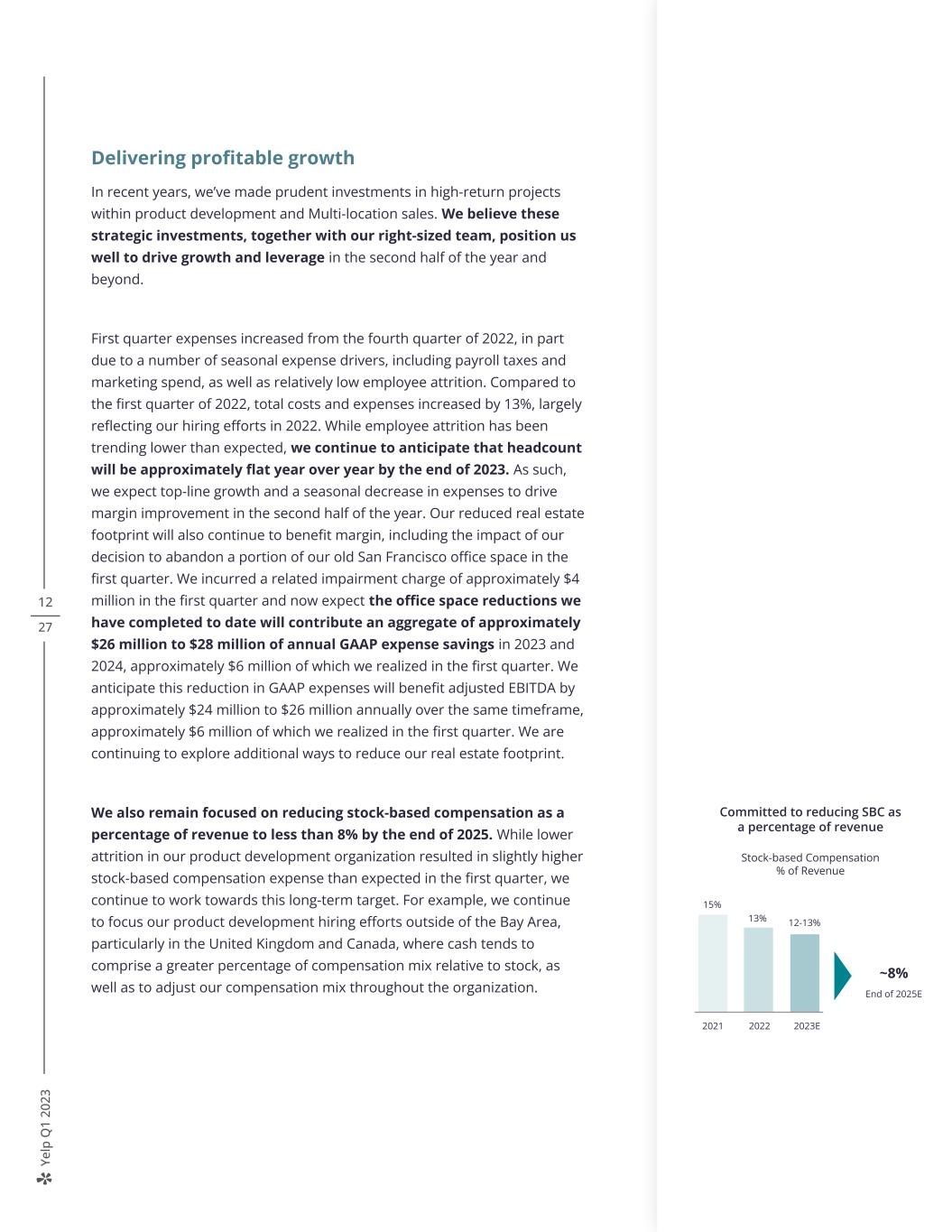 Ye lp Q 1 20 23 12 27 Delivering profitable growth In recent years, we’ve made prudent investments in high-return projects within product development and Multi-location sales. We believe these strategic investments, together with our right-sized team, position us well to drive growth and leverage in the second half of the year and beyond. First quarter expenses increased from the fourth quarter of 2022, in part due to a number of seasonal expense drivers, including payroll taxes and marketing spend, as well as relatively low employee attrition. Compared to the first quarter of 2022, total costs and expenses increased by 13%, largely reflecting our hiring efforts in 2022. While employee attrition has been trending lower than expected, we continue to anticipate that headcount will be approximately flat year over year by the end of 2023. As such, we expect top-line growth and a seasonal decrease in expenses to drive margin improvement in the second half of the year. Our reduced real estate footprint will also continue to benefit margin, including the impact of our decision to abandon a portion of our old San Francisco office space in the first quarter. We incurred a related impairment charge of approximately $4 million in the first quarter and now expect the office space reductions we have completed to date will contribute an aggregate of approximately $26 million to $28 million of annual GAAP expense savings in 2023 and 2024, approximately $6 million of which we realized in the first quarter. We anticipate this reduction in GAAP expenses will benefit adjusted EBITDA by approximately $24 million to $26 million annually over the same timeframe, approximately $6 million of which we realized in the first quarter. We are continuing to explore additional ways to reduce our real estate footprint. We also remain focused on reducing stock-based compensation as a percentage of revenue to less than 8% by the end of 2025. While lower attrition in our product development organization resulted in slightly higher stock-based compensation expense than expected in the first quarter, we continue to work towards this long-term target. For example, we continue to focus our product development hiring efforts outside of the Bay Area, particularly in the United Kingdom and Canada, where cash tends to comprise a greater percentage of compensation mix relative to stock, as well as to adjust our compensation mix throughout the organization. 8% Exhibit 9 2021 2022 2023E End of 2025E 15% 13% 12-13% ~8% Committed to reducing SBC as a percentage of revenue Stock-based Compensation % of Revenue