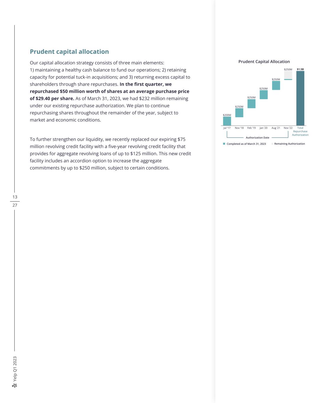 Ye lp Q 1 20 23 Total Repurchase Authorization Nov ‘22 13 27 Prudent capital allocation Our capital allocation strategy consists of three main elements: 1) maintaining a healthy cash balance to fund our operations; 2) retaining capacity for potential tuck-in acquisitions; and 3) returning excess capital to shareholders through share repurchases. In the first quarter, we repurchased $50 million worth of shares at an average purchase price of $29.40 per share. As of March 31, 2023, we had $232 million remaining under our existing repurchase authorization. We plan to continue repurchasing shares throughout the remainder of the year, subject to market and economic conditions. To further strengthen our liquidity, we recently replaced our expiring $75 million revolving credit facility with a five-year revolving credit facility that provides for aggregate revolving loans of up to $125 million. This new credit facility includes an accordion option to increase the aggregate commitments by up to $250 million, subject to certain conditions. Authorization Date Prudent Capital Allocation $1.5B Completed as of March 31, 2023 Remaining Authorization $200M Jul ‘17 Nov ‘18 Feb ‘19 Jan ‘20 $250M $250M $250M $250M Aug ‘21 $250M