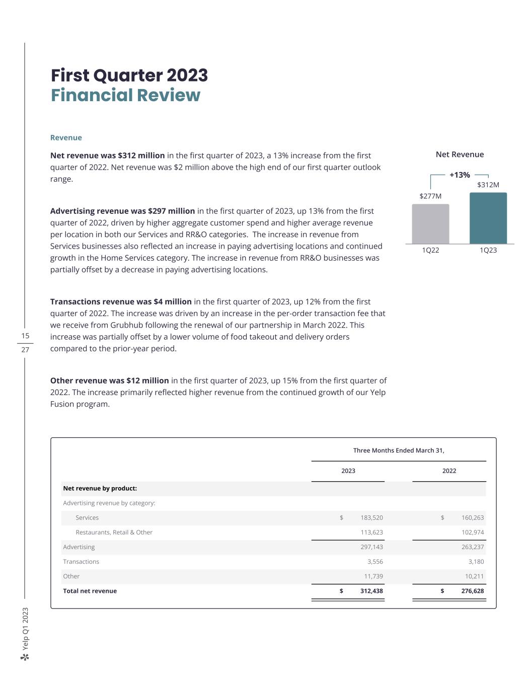 Ye lp Q 1 20 23 15 27 Revenue Net revenue was $312 million in the first quarter of 2023, a 13% increase from the first quarter of 2022. Net revenue was $2 million above the high end of our first quarter outlook range. Advertising revenue was $297 million in the first quarter of 2023, up 13% from the first quarter of 2022, driven by higher aggregate customer spend and higher average revenue per location in both our Services and RR&O categories. The increase in revenue from Services businesses also reflected an increase in paying advertising locations and continued growth in the Home Services category. The increase in revenue from RR&O businesses was partially offset by a decrease in paying advertising locations. Transactions revenue was $4 million in the first quarter of 2023, up 12% from the first quarter of 2022. The increase was driven by an increase in the per-order transaction fee that we receive from Grubhub following the renewal of our partnership in March 2022. This increase was partially offset by a lower volume of food takeout and delivery orders compared to the prior-year period. Other revenue was $12 million in the first quarter of 2023, up 15% from the first quarter of 2022. The increase primarily reflected higher revenue from the continued growth of our Yelp Fusion program. First Quarter 2023 Financial Review Three Months Ended March 31, 2023 2022 Net revenue by product: Advertising revenue by category: Services $ 183,520 $ 160,263 Restaurants, Retail & Other 113,623 102,974 Advertising 297,143 263,237 Transactions 3,556 3,180 Other 11,739 10,211 Total net revenue $ 312,438 $ 276,628 Net Revenue +13% $277M $312M 1Q22 1Q23