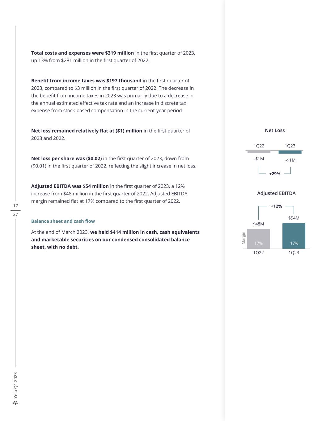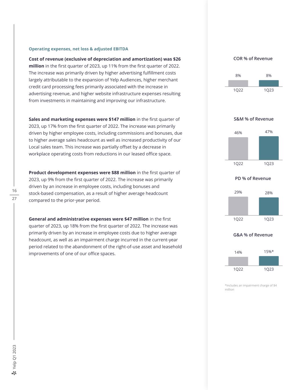 Ye lp Q 1 20 23 16 27 Operating expenses, net loss & adjusted EBITDA Cost of revenue (exclusive of depreciation and amortization) was $26 million in the first quarter of 2023, up 11% from the first quarter of 2022. The increase was primarily driven by higher advertising fulfillment costs largely attributable to the expansion of Yelp Audiences, higher merchant credit card processing fees primarily associated with the increase in advertising revenue, and higher website infrastructure expenses resulting from investments in maintaining and improving our infrastructure. Sales and marketing expenses were $147 million in the first quarter of 2023, up 17% from the first quarter of 2022. The increase was primarily driven by higher employee costs, including commissions and bonuses, due to higher average sales headcount as well as increased productivity of our Local sales team. This increase was partially offset by a decrease in workplace operating costs from reductions in our leased office space. Product development expenses were $88 million in the first quarter of 2023, up 9% from the first quarter of 2022. The increase was primarily driven by an increase in employee costs, including bonuses and stock-based compensation, as a result of higher average headcount compared to the prior-year period. General and administrative expenses were $47 million in the first quarter of 2023, up 18% from the first quarter of 2022. The increase was primarily driven by an increase in employee costs due to higher average headcount, as well as an impairment charge incurred in the current-year period related to the abandonment of the right-of-use asset and leasehold improvements of one of our office spaces. COR % of Revenue 8% 8% 1Q22 1Q23 S&M % of Revenue 46% 47% 1Q22 1Q23 PD % of Revenue 29% 28% 1Q22 1Q23 G&A % of Revenue 14% 15%* 1Q22 1Q23 *Includes an impairment charge of $4 million