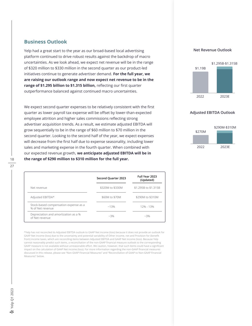 Ye lp Q 1 20 23 18 27 Business Outlook Yelp had a great start to the year as our broad-based local advertising platform continued to drive robust results against the backdrop of macro uncertainties. As we look ahead, we expect net revenue will be in the range of $320 million to $330 million in the second quarter as our product-led initiatives continue to generate advertiser demand. For the full year, we are raising our outlook range and now expect net revenue to be in the range of $1.295 billion to $1.315 billion, reflecting our first quarter outperformance balanced against continued macro uncertainties. We expect second quarter expenses to be relatively consistent with the first quarter as lower payroll tax expense will be offset by lower-than-expected employee attrition and higher sales commissions reflecting strong advertiser acquisition trends. As a result, we estimate adjusted EBITDA will grow sequentially to be in the range of $60 million to $70 million in the second quarter. Looking to the second half of the year, we expect expenses will decrease from the first half due to expense seasonality, including lower sales and marketing expense in the fourth quarter. When combined with our expected revenue growth, we anticipate adjusted EBITDA will be in the range of $290 million to $310 million for the full year. $270M Adjusted EBITDA Outlook 2022 2023E $290M-$310M 2022 2023E $1.19B $1.295B-$1.315B Net Revenue Outlook Second Quarter 2023 Full Year 2023 (Updated) Net revenue $320M to $330M $1.295B to $1.315B Adjusted EBITDA* $60M to $70M $290M to $310M Stock-based compensation expense as a % of Net revenue ~13% 12% - 13% Depreciation and amortization as a % of Net revenue ~3% ~3% *Yelp has not reconciled its Adjusted EBITDA outlook to GAAP Net income (loss) because it does not provide an outlook for GAAP Net income (loss) due to the uncertainty and potential variability of Other income, net and Provision for (benefit from) income taxes, which are reconciling items between Adjusted EBITDA and GAAP Net income (loss). Because Yelp cannot reasonably predict such items, a reconciliation of the non-GAAP financial measure outlook to the corresponding GAAP measure is not available without unreasonable effort. We caution, however, that such items could have a significant impact on the calculation of GAAP Net income (loss). For more information regarding the non-GAAP financial measures discussed in this release, please see “Non-GAAP Financial Measures” and “Reconciliation of GAAP to Non-GAAP Financial Measures” below.