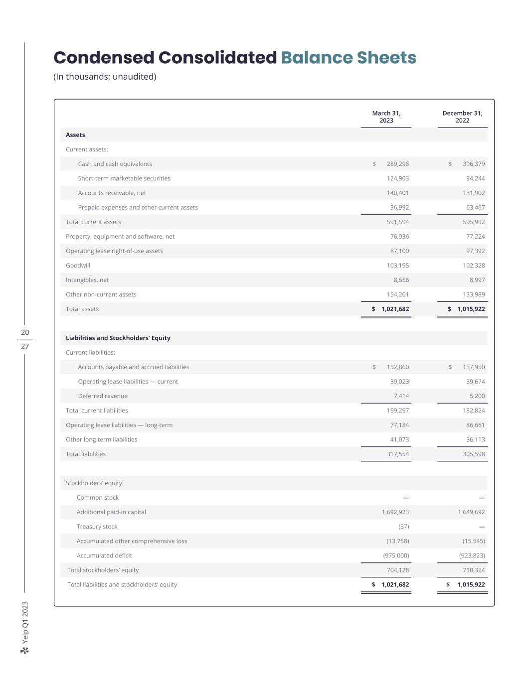 Ye lp Q 1 20 23 20 27 Condensed Consolidated Balance Sheets (In thousands; unaudited) March 31, 2023 December 31, 2022 Assets Current assets: Cash and cash equivalents $ 289,298 $ 306,379 Short-term marketable securities 124,903 94,244 Accounts receivable, net 140,401 131,902 Prepaid expenses and other current assets 36,992 63,467 Total current assets 591,594 595,992 Property, equipment and software, net 76,936 77,224 Operating lease right-of-use assets 87,100 97,392 Goodwill 103,195 102,328 Intangibles, net 8,656 8,997 Other non-current assets 154,201 133,989 Total assets $ 1,021,682 $ 1,015,922 Liabilities and Stockholders’ Equity Current liabilities: Accounts payable and accrued liabilities $ 152,860 $ 137,950 Operating lease liabilities — current 39,023 39,674 Deferred revenue 7,414 5,200 Total current liabilities 199,297 182,824 Operating lease liabilities — long-term 77,184 86,661 Other long-term liabilities 41,073 36,113 Total liabilities 317,554 305,598 Stockholders’ equity: Common stock — — Additional paid-in capital 1,692,923 1,649,692 Treasury stock (37) — Accumulated other comprehensive loss (13,758) (15,545) Accumulated deficit (975,000) (923,823) Total stockholders’ equity 704,128 710,324 Total liabilities and stockholders’ equity $ 1,021,682 $ 1,015,922