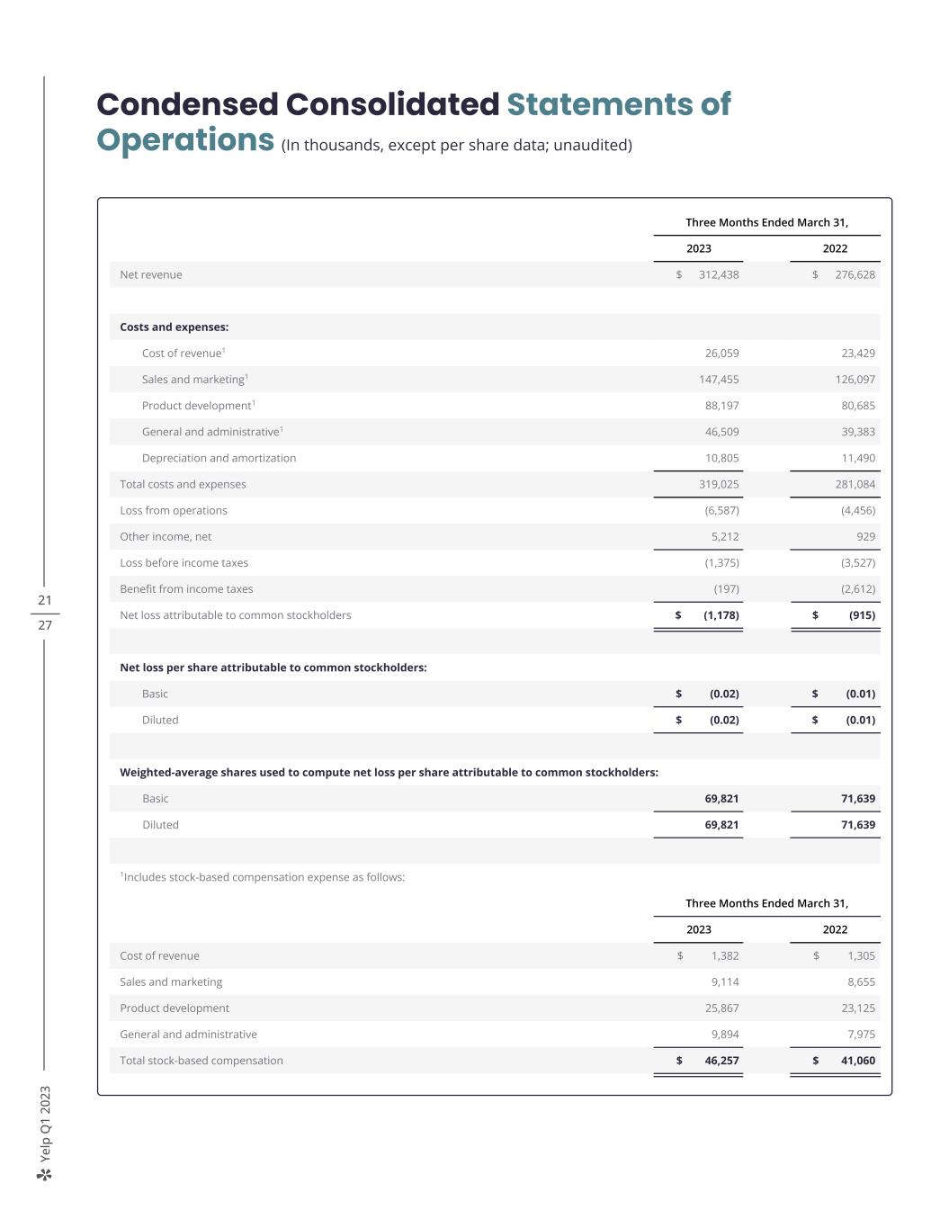 Ye lp Q 1 20 23 21 27 Condensed Consolidated Statements of Operations (In thousands, except per share data; unaudited) Three Months Ended March 31, 2023 2022 Net revenue $ 312,438 $ 276,628 Costs and expenses: Cost of revenue1 26,059 23,429 Sales and marketing1 147,455 126,097 Product development1 88,197 80,685 General and administrative1 46,509 39,383 Depreciation and amortization 10,805 11,490 Total costs and expenses 319,025 281,084 Loss from operations (6,587) (4,456) Other income, net 5,212 929 Loss before income taxes (1,375) (3,527) Benefit from income taxes (197) (2,612) Net loss attributable to common stockholders $ (1,178) $ (915) Net loss per share attributable to common stockholders: Basic $ (0.02) $ (0.01) Diluted $ (0.02) $ (0.01) Weighted-average shares used to compute net loss per share attributable to common stockholders: Basic 69,821 71,639 Diluted 69,821 71,639 1Includes stock-based compensation expense as follows: Three Months Ended March 31, 2023 2022 Cost of revenue $ 1,382 $ 1,305 Sales and marketing 9,114 8,655 Product development 25,867 23,125 General and administrative 9,894 7,975 Total stock-based compensation $ 46,257 $ 41,060