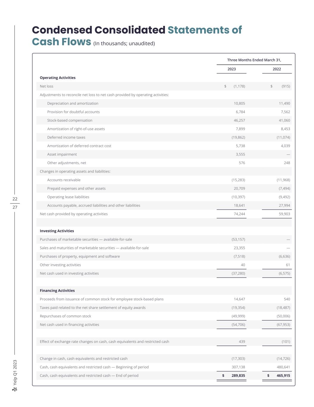 Ye lp Q 1 20 23 22 27 Condensed Consolidated Statements of Cash Flows (In thousands; unaudited) Three Months Ended March 31, 2023 2022 Operating Activities Net loss $ (1,178) $ (915) Adjustments to reconcile net loss to net cash provided by operating activities: Depreciation and amortization 10,805 11,490 Provision for doubtful accounts 6,784 7,562 Stock-based compensation 46,257 41,060 Amortization of right-of-use assets 7,899 8,453 Deferred income taxes (19,862) (11,074) Amortization of deferred contract cost 5,738 4,039 Asset impairment 3,555 — Other adjustments, net 576 248 Changes in operating assets and liabilities: Accounts receivable (15,283) (11,968) Prepaid expenses and other assets 20,709 (7,494) Operating lease liabilities (10,397) (9,492) Accounts payable, accrued liabilities and other liabilities 18,641 27,994 Net cash provided by operating activities 74,244 59,903 Investing Activities Purchases of marketable securities — available-for-sale (53,157) — Sales and maturities of marketable securities — available-for-sale 23,355 — Purchases of property, equipment and software (7,518) (6,636) Other investing activities 40 61 Net cash used in investing activities (37,280) (6,575) Financing Activities Proceeds from issuance of common stock for employee stock-based plans 14,647 540 Taxes paid related to the net share settlement of equity awards (19,354) (18,487) Repurchases of common stock (49,999) (50,006) Net cash used in financing activities (54,706) (67,953) Effect of exchange rate changes on cash, cash equivalents and restricted cash 439 (101) Change in cash, cash equivalents and restricted cash (17,303) (14,726) Cash, cash equivalents and restricted cash — Beginning of period 307,138 480,641 Cash, cash equivalents and restricted cash — End of period $ 289,835 $ 465,915