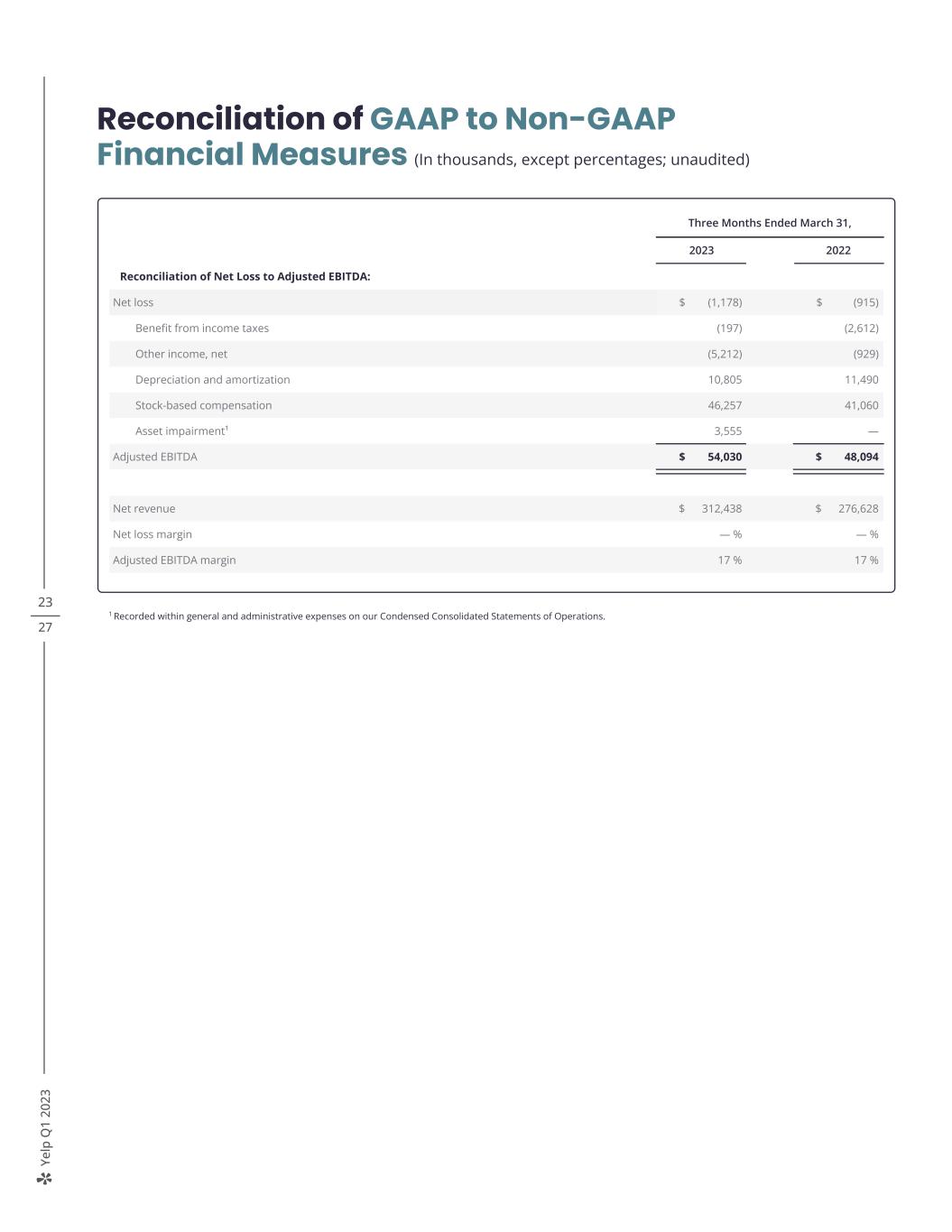 Ye lp Q 1 20 23 23 27 Reconciliation of GAAP to Non-GAAP Financial Measures (In thousands, except percentages; unaudited) 1 Recorded within general and administrative expenses on our Condensed Consolidated Statements of Operations. Three Months Ended March 31, 2023 2022 Reconciliation of Net Loss to Adjusted EBITDA: Net loss $ (1,178) $ (915) Benefit from income taxes (197) (2,612) Other income, net (5,212) (929) Depreciation and amortization 10,805 11,490 Stock-based compensation 46,257 41,060 Asset impairment¹ 3,555 — Adjusted EBITDA $ 54,030 $ 48,094 Net revenue $ 312,438 $ 276,628 Net loss margin — % — % Adjusted EBITDA margin 17 % 17 %