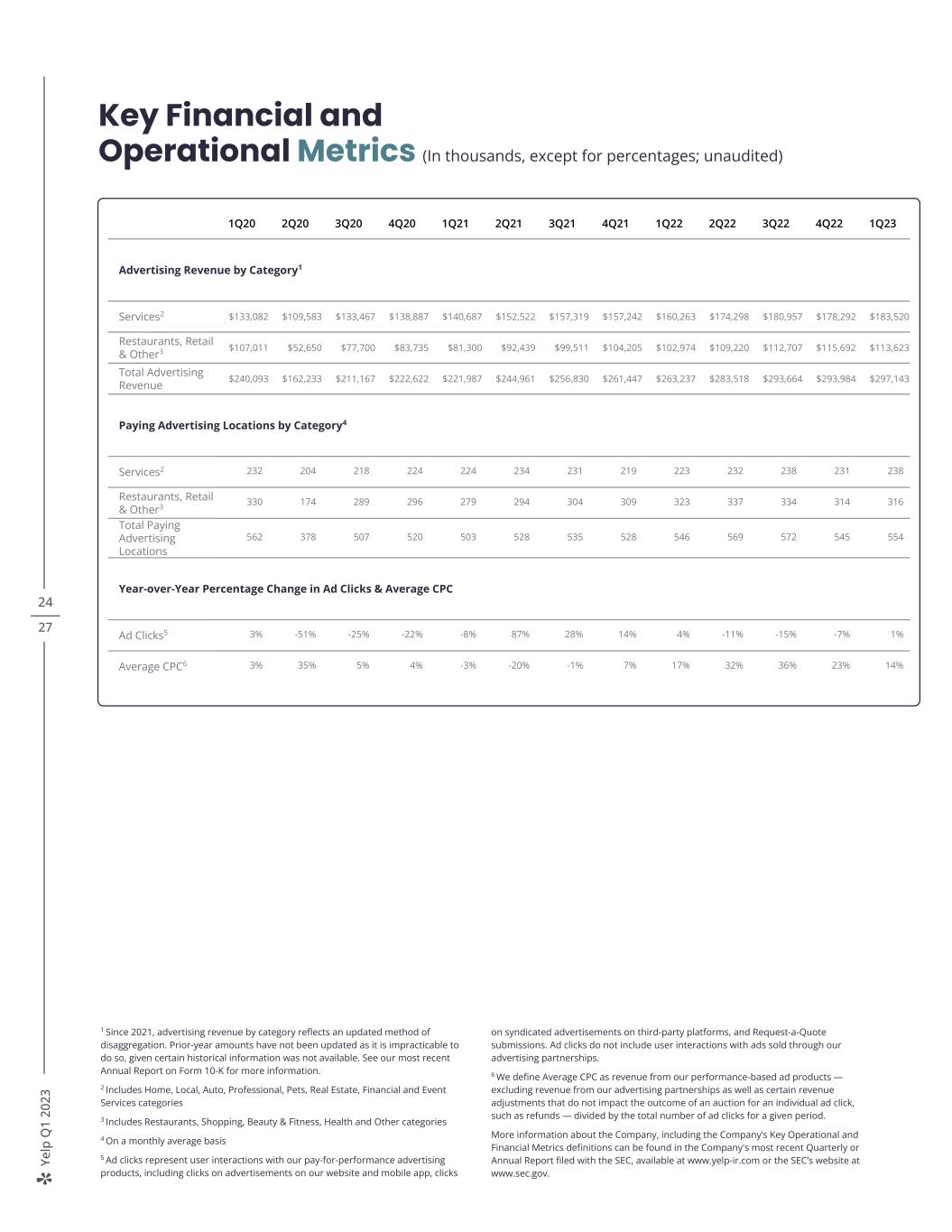 Ye lp Q 1 20 23 24 27 Key Financial and Operational Metrics (In thousands, except for percentages; unaudited) 1Q20 2Q20 3Q20 4Q20 1Q21 2Q21 3Q21 4Q21 1Q22 2Q22 3Q22 4Q22 1Q23 Advertising Revenue by Category1 Services2 $133,082 $109,583 $133,467 $138,887 $140,687 $152,522 $157,319 $157,242 $160,263 $174,298 $180,957 $178,292 $183,520 Restaurants, Retail & Other3 $107,011 $52,650 $77,700 $83,735 $81,300 $92,439 $99,511 $104,205 $102,974 $109,220 $112,707 $115,692 $113,623 Total Advertising Revenue $240,093 $162,233 $211,167 $222,622 $221,987 $244,961 $256,830 $261,447 $263,237 $283,518 $293,664 $293,984 $297,143 Paying Advertising Locations by Category4 Services2 232 204 218 224 224 234 231 219 223 232 238 231 238 Restaurants, Retail & Other3 330 174 289 296 279 294 304 309 323 337 334 314 316 Total Paying Advertising Locations 562 378 507 520 503 528 535 528 546 569 572 545 554 Year-over-Year Percentage Change in Ad Clicks & Average CPC Ad Clicks5 3% -51% -25% -22% -8% 87% 28% 14% 4% -11% -15% -7% 1% Average CPC6 3% 35% 5% 4% -3% -20% -1% 7% 17% 32% 36% 23% 14% 1 Since 2021, advertising revenue by category reflects an updated method of disaggregation. Prior-year amounts have not been updated as it is impracticable to do so, given certain historical information was not available. See our most recent Annual Report on Form 10-K for more information. 2 Includes Home, Local, Auto, Professional, Pets, Real Estate, Financial and Event Services categories 3 Includes Restaurants, Shopping, Beauty & Fitness, Health and Other categories 4 On a monthly average basis 5 Ad clicks represent user interactions with our pay-for-performance advertising products, including clicks on advertisements on our website and mobile app, clicks on syndicated advertisements on third-party platforms, and Request-a-Quote submissions. Ad clicks do not include user interactions with ads sold through our advertising partnerships. 6 We define Average CPC as revenue from our performance-based ad products — excluding revenue from our advertising partnerships as well as certain revenue adjustments that do not impact the outcome of an auction for an individual ad click, such as refunds — divided by the total number of ad clicks for a given period. More information about the Company, including the Company’s Key Operational and Financial Metrics definitions can be found in the Company's most recent Quarterly or Annual Report filed with the SEC, available at www.yelp-ir.com or the SEC’s website at www.sec.gov.