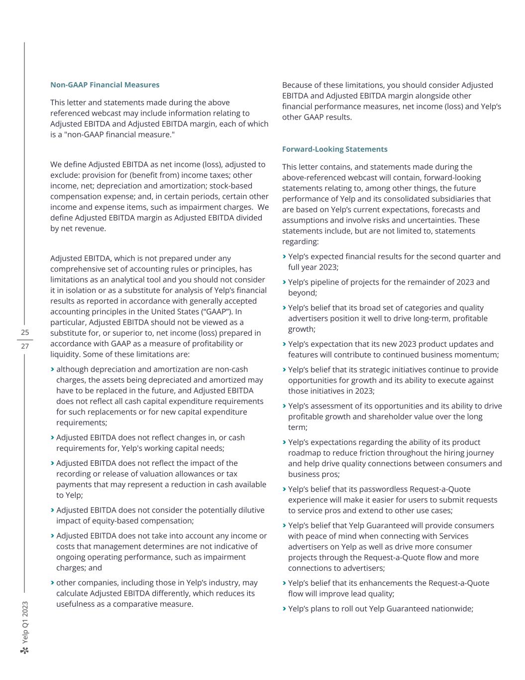 Ye lp Q 1 20 23 Non-GAAP Financial Measures This letter and statements made during the above referenced webcast may include information relating to Adjusted EBITDA and Adjusted EBITDA margin, each of which is a "non-GAAP financial measure." We define Adjusted EBITDA as net income (loss), adjusted to exclude: provision for (benefit from) income taxes; other income, net; depreciation and amortization; stock-based compensation expense; and, in certain periods, certain other income and expense items, such as impairment charges. We define Adjusted EBITDA margin as Adjusted EBITDA divided by net revenue. Adjusted EBITDA, which is not prepared under any comprehensive set of accounting rules or principles, has limitations as an analytical tool and you should not consider it in isolation or as a substitute for analysis of Yelp’s financial results as reported in accordance with generally accepted accounting principles in the United States (“GAAP”). In particular, Adjusted EBITDA should not be viewed as a substitute for, or superior to, net income (loss) prepared in accordance with GAAP as a measure of profitability or liquidity. Some of these limitations are: > although depreciation and amortization are non-cash charges, the assets being depreciated and amortized may have to be replaced in the future, and Adjusted EBITDA does not reflect all cash capital expenditure requirements for such replacements or for new capital expenditure requirements; > Adjusted EBITDA does not reflect changes in, or cash requirements for, Yelp's working capital needs; > Adjusted EBITDA does not reflect the impact of the recording or release of valuation allowances or tax payments that may represent a reduction in cash available to Yelp; > Adjusted EBITDA does not consider the potentially dilutive impact of equity-based compensation; > Adjusted EBITDA does not take into account any income or costs that management determines are not indicative of ongoing operating performance, such as impairment charges; and > other companies, including those in Yelp’s industry, may calculate Adjusted EBITDA differently, which reduces its usefulness as a comparative measure. Because of these limitations, you should consider Adjusted EBITDA and Adjusted EBITDA margin alongside other financial performance measures, net income (loss) and Yelp’s other GAAP results. Forward-Looking Statements This letter contains, and statements made during the above-referenced webcast will contain, forward-looking statements relating to, among other things, the future performance of Yelp and its consolidated subsidiaries that are based on Yelp’s current expectations, forecasts and assumptions and involve risks and uncertainties. These statements include, but are not limited to, statements regarding: > Yelp’s expected financial results for the second quarter and full year 2023; > Yelp’s pipeline of projects for the remainder of 2023 and beyond; > Yelp’s belief that its broad set of categories and quality advertisers position it well to drive long-term, profitable growth; > Yelp’s expectation that its new 2023 product updates and features will contribute to continued business momentum; > Yelp’s belief that its strategic initiatives continue to provide opportunities for growth and its ability to execute against those initiatives in 2023; > Yelp’s assessment of its opportunities and its ability to drive profitable growth and shareholder value over the long term; > Yelp’s expectations regarding the ability of its product roadmap to reduce friction throughout the hiring journey and help drive quality connections between consumers and business pros; > Yelp’s belief that its passwordless Request-a-Quote experience will make it easier for users to submit requests to service pros and extend to other use cases; > Yelp’s belief that Yelp Guaranteed will provide consumers with peace of mind when connecting with Services advertisers on Yelp as well as drive more consumer projects through the Request-a-Quote flow and more connections to advertisers; > Yelp’s belief that its enhancements the Request-a-Quote flow will improve lead quality; > Yelp’s plans to roll out Yelp Guaranteed nationwide; 25 27