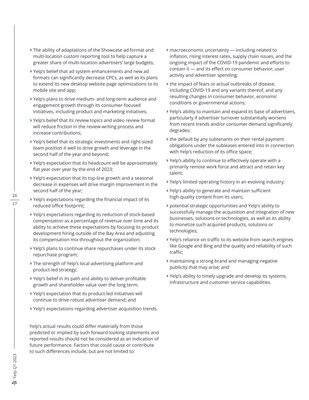 Ye lp Q 1 20 23 > The ability of adaptations of the Showcase ad format and multi-location custom reporting tool to help capture a greater share of multi-location advertisers’ large budgets; > Yelp’s belief that ad system enhancements and new ad formats can significantly decrease CPCs, as well as its plans to extend its new desktop website page optimizations to its mobile site and app; > Yelp’s plans to drive medium- and long-term audience and engagement growth through its consumer-focused initiatives, including product and marketing initiatives; > Yelp’s belief that its review topics and video review format will reduce friction in the review-writing process and increase contributions; > Yelp’s belief that its strategic investments and right-sized team position it well to drive growth and leverage in the second half of the year and beyond; > Yelp’s expectation that its headcount will be approximately flat year over year by the end of 2023; > Yelp’s expectation that its top-line growth and a seasonal decrease in expenses will drive margin improvement in the second half of the year; > Yelp’s expectations regarding the financial impact of its reduced office footprint; > Yelp’s expectations regarding its reduction of stock-based compensation as a percentage of revenue over time and its ability to achieve these expectations by focusing its product development hiring outside of the Bay Area and adjusting its compensation mix throughout the organization; > Yelp’s plans to continue share repurchases under its stock repurchase program; > The strength of Yelp’s local advertising platform and product-led strategy; > Yelp’s belief in its path and ability to deliver profitable growth and shareholder value over the long term; > Yelp’s expectation that its product-led initiatives will continue to drive robust advertiser demand; and > Yelp’s expectations regarding advertiser acquisition trends. Yelp’s actual results could differ materially from those predicted or implied by such forward-looking statements and reported results should not be considered as an indication of future performance. Factors that could cause or contribute to such differences include, but are not limited to: > macroeconomic uncertainty — including related to inflation, rising interest rates, supply chain issues, and the ongoing impact of the COVID-19 pandemic and efforts to contain it — and its effect on consumer behavior, user activity and advertiser spending; > the impact of fears or actual outbreaks of disease, including COVID-19 and any variants thereof, and any resulting changes in consumer behavior, economic conditions or governmental actions; > Yelp’s ability to maintain and expand its base of advertisers, particularly if advertiser turnover substantially worsens from recent trends and/or consumer demand significantly degrades; > the default by any subtenants on their rental payment obligations under the subleases entered into in connection with Yelp’s reduction of its office space; > Yelp’s ability to continue to effectively operate with a primarily remote work force and attract and retain key talent; > Yelp’s limited operating history in an evolving industry; > Yelp’s ability to generate and maintain sufficient high-quality content from its users; > potential strategic opportunities and Yelp’s ability to successfully manage the acquisition and integration of new businesses, solutions or technologies, as well as its ability to monetize such acquired products, solutions or technologies; > Yelp’s reliance on traffic to its website from search engines like Google and Bing and the quality and reliability of such traffic; > maintaining a strong brand and managing negative publicity that may arise; and > Yelp’s ability to timely upgrade and develop its systems, infrastructure and customer service capabilities. 26 27