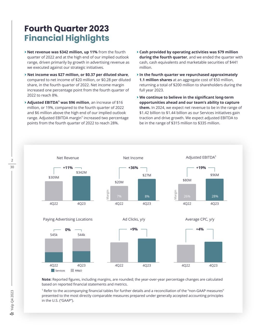 Ye lp Q 4 20 23 2 30 Note: Reported figures, including margins, are rounded; the year-over-year percentage changes are calculated based on reported financial statements and metrics. 1 Refer to the accompanying financial tables for further details and a reconciliation of the “non-GAAP measures” presented to the most directly comparable measures prepared under generally accepted accounting principles in the U.S. (“GAAP”). Fourth Quarter 2023 Financial Highlights > Net revenue was $342 million, up 11% from the fourth quarter of 2022 and at the high end of our implied outlook range, driven primarily by growth in advertising revenue as we executed against our strategic initiatives. > Net income was $27 million, or $0.37 per diluted share, compared to net income of $20 million, or $0.28 per diluted share, in the fourth quarter of 2022. Net income margin increased one percentage point from the fourth quarter of 2022 to reach 8%. > Adjusted EBITDA¹ was $96 million, an increase of $16 million, or 19%, compared to the fourth quarter of 2022 and $6 million above the high end of our implied outlook range. Adjusted EBITDA margin¹ increased two percentage points from the fourth quarter of 2022 to reach 28%. > Cash provided by operating activities was $79 million during the fourth quarter, and we ended the quarter with cash, cash equivalents and marketable securities of $441 million. > In the fourth quarter we repurchased approximately 1.1 million shares at an aggregate cost of $50 million, returning a total of $200 million to shareholders during the full year 2023. > We continue to believe in the significant long-term opportunities ahead and our team’s ability to capture them. In 2024, we expect net revenue to be in the range of $1.42 billion to $1.44 billion as our Services initiatives gain traction and drive growth. We expect adjusted EBITDA to be in the range of $315 million to $335 million. 19% 17% Net Revenue +11% $309M $342M 4Q22 4Q23 Ad Clicks, y/y +9% 4Q22 4Q23 Average CPC, y/y +4% 4Q22 4Q23 Paying Advertising Locations 0% 545k 544k 4Q22 4Q23 Services RR&O Adjusted EBITDA¹ +19% $80M $96M 4Q22 4Q23 M ar gi n 26% 28%8% 7% M ar gi n Net Income +36% $20M $27M 4Q22 4Q23 87