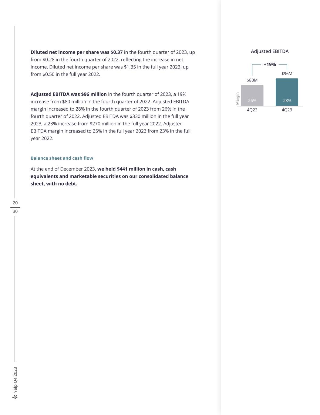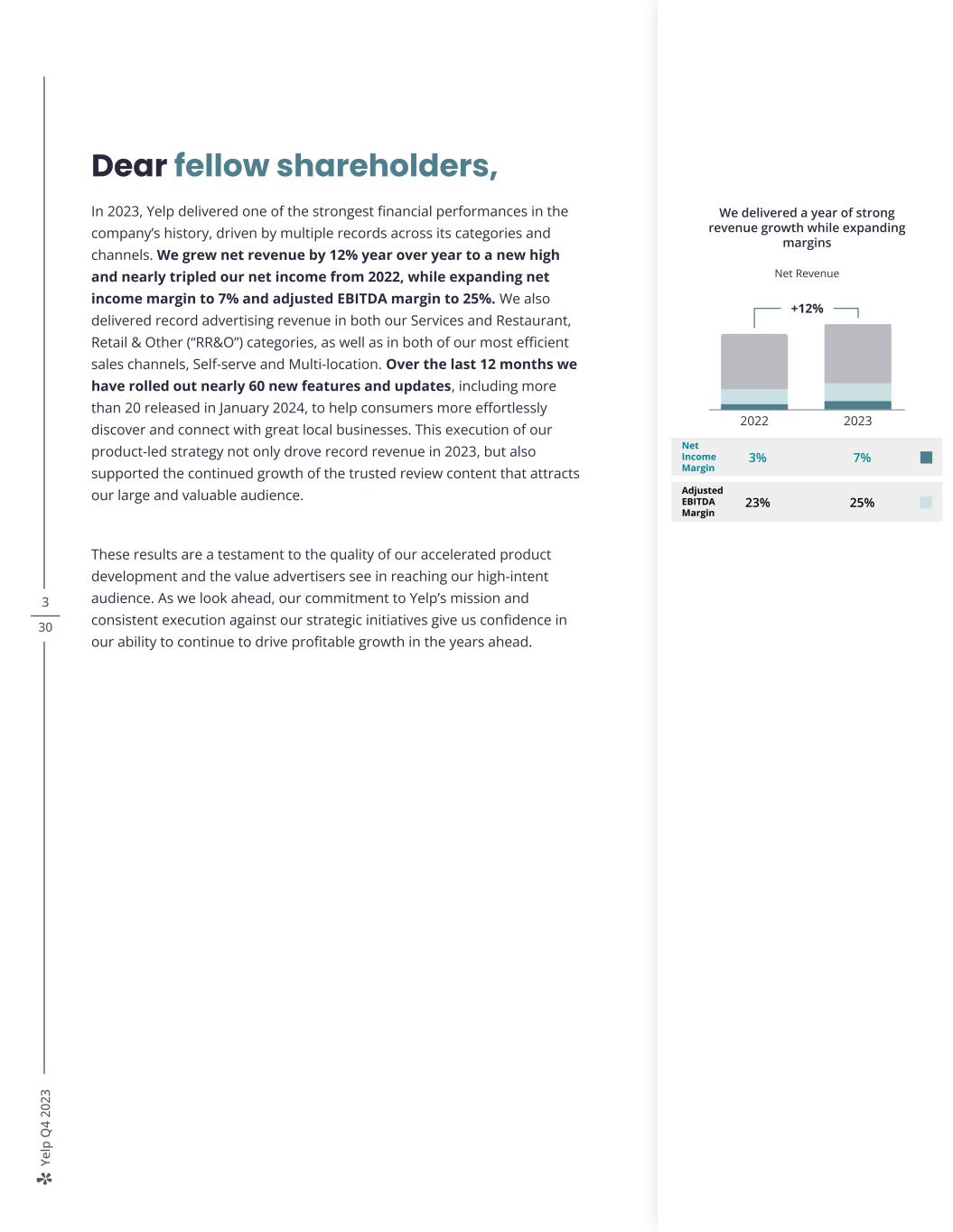 Ye lp Q 4 20 23 3 30 Dear fellow shareholders, In 2023, Yelp delivered one of the strongest financial performances in the company’s history, driven by multiple records across its categories and channels. We grew net revenue by 12% year over year to a new high and nearly tripled our net income from 2022, while expanding net income margin to 7% and adjusted EBITDA margin to 25%. We also delivered record advertising revenue in both our Services and Restaurant, Retail & Other (“RR&O”) categories, as well as in both of our most efficient sales channels, Self-serve and Multi-location. Over the last 12 months we have rolled out nearly 60 new features and updates, including more than 20 released in January 2024, to help consumers more effortlessly discover and connect with great local businesses. This execution of our product-led strategy not only drove record revenue in 2023, but also supported the continued growth of the trusted review content that attracts our large and valuable audience. These results are a testament to the quality of our accelerated product development and the value advertisers see in reaching our high-intent audience. As we look ahead, our commitment to Yelp’s mission and consistent execution against our strategic initiatives give us confidence in our ability to continue to drive profitable growth in the years ahead. +2 ppt 3% 4% 2Q22 2Q23 Net Income Margin 2022 2023 Net Income Margin 7%3% Adjusted EBITDA Margin 25%23% +12% We delivered a year of strong revenue growth while expanding margins Net Revenue