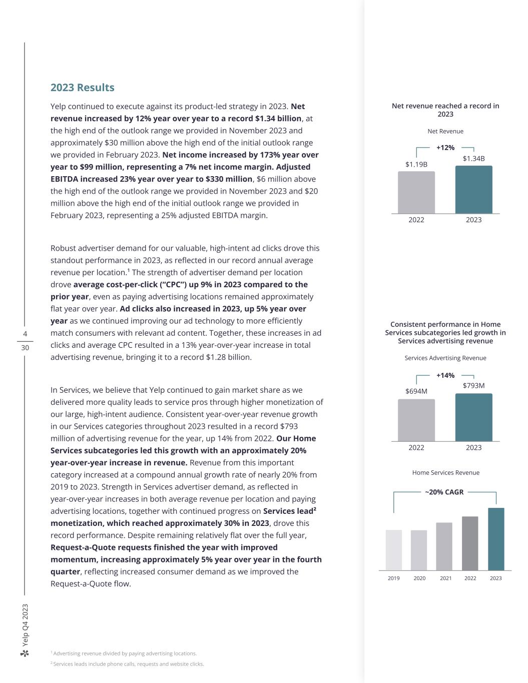 Ye lp Q 4 20 23 4 30 2023 Results Yelp continued to execute against its product-led strategy in 2023. Net revenue increased by 12% year over year to a record $1.34 billion, at the high end of the outlook range we provided in November 2023 and approximately $30 million above the high end of the initial outlook range we provided in February 2023. Net income increased by 173% year over year to $99 million, representing a 7% net income margin. Adjusted EBITDA increased 23% year over year to $330 million, $6 million above the high end of the outlook range we provided in November 2023 and $20 million above the high end of the initial outlook range we provided in February 2023, representing a 25% adjusted EBITDA margin. Robust advertiser demand for our valuable, high-intent ad clicks drove this standout performance in 2023, as reflected in our record annual average revenue per location.¹ The strength of advertiser demand per location drove average cost-per-click (“CPC”) up 9% in 2023 compared to the prior year, even as paying advertising locations remained approximately flat year over year. Ad clicks also increased in 2023, up 5% year over year as we continued improving our ad technology to more efficiently match consumers with relevant ad content. Together, these increases in ad clicks and average CPC resulted in a 13% year-over-year increase in total advertising revenue, bringing it to a record $1.28 billion. In Services, we believe that Yelp continued to gain market share as we delivered more quality leads to service pros through higher monetization of our large, high-intent audience. Consistent year-over-year revenue growth in our Services categories throughout 2023 resulted in a record $793 million of advertising revenue for the year, up 14% from 2022. Our Home Services subcategories led this growth with an approximately 20% year-over-year increase in revenue. Revenue from this important category increased at a compound annual growth rate of nearly 20% from 2019 to 2023. Strength in Services advertiser demand, as reflected in year-over-year increases in both average revenue per location and paying advertising locations, together with continued progress on Services lead² monetization, which reached approximately 30% in 2023, drove this record performance. Despite remaining relatively flat over the full year, Request-a-Quote requests finished the year with improved momentum, increasing approximately 5% year over year in the fourth quarter, reflecting increased consumer demand as we improved the Request-a-Quote flow. 1 Advertising revenue divided by paying advertising locations. 2 Services leads include phone calls, requests and website clicks. Net revenue reached a record in 2023 Net Revenue +12% $1.19B $1.34B 2022 2023 +14% $694M $793M 2022 2023 Home Services Revenue ~20% CAGR 2019 2020 2021 2022 2023 Consistent performance in Home Services subcategories led growth in Services advertising revenue Services Advertising Revenue