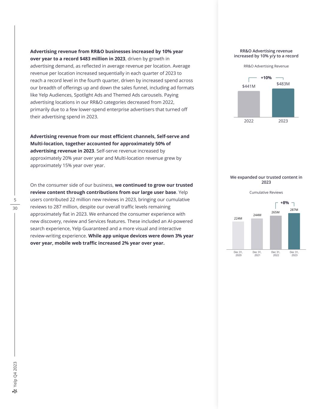 Ye lp Q 4 20 23 5 30 Advertising revenue from RR&O businesses increased by 10% year over year to a record $483 million in 2023, driven by growth in advertising demand, as reflected in average revenue per location. Average revenue per location increased sequentially in each quarter of 2023 to reach a record level in the fourth quarter, driven by increased spend across our breadth of offerings up and down the sales funnel, including ad formats like Yelp Audiences, Spotlight Ads and Themed Ads carousels. Paying advertising locations in our RR&O categories decreased from 2022, primarily due to a few lower-spend enterprise advertisers that turned off their advertising spend in 2023. Advertising revenue from our most efficient channels, Self-serve and Multi-location, together accounted for approximately 50% of advertising revenue in 2023. Self-serve revenue increased by approximately 20% year over year and Multi-location revenue grew by approximately 15% year over year. On the consumer side of our business, we continued to grow our trusted review content through contributions from our large user base. Yelp users contributed 22 million new reviews in 2023, bringing our cumulative reviews to 287 million, despite our overall traffic levels remaining approximately flat in 2023. We enhanced the consumer experience with new discovery, review and Services features. These included an AI-powered search experience, Yelp Guaranteed and a more visual and interactive review-writing experience. While app unique devices were down 3% year over year, mobile web traffic increased 2% year over year. ~20% 3Q22 3Q23 +14% Local, Auto, Professional, Pets, Real Estate, Financial and Event Services Home Services Services growth led by Home Services Services Revenue +10% $441M $483M 2022 2023 RR&O Advertising revenue increased by 10% y/y to a record RR&O Advertising Revenue $94 $112 287M We expanded our trusted content in 2023 Cumulative Reviews Dec 31, 2020 Dec 31, 2021 Dec 31, 2022 Dec 31, 2023 244M 265M 224M +8%