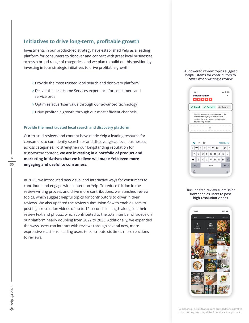 Ye lp Q 4 20 23 6 30 Initiatives to drive long-term, profitable growth Investments in our product-led strategy have established Yelp as a leading platform for consumers to discover and connect with great local businesses across a broad range of categories, and we plan to build on this position by investing in four strategic initiatives to drive profitable growth: > Provide the most trusted local search and discovery platform > Deliver the best Home Services experience for consumers and service pros > Optimize advertiser value through our advanced technology > Drive profitable growth through our most efficient channels Provide the most trusted local search and discovery platform Our trusted reviews and content have made Yelp a leading resource for consumers to confidently search for and discover great local businesses across categories. To strengthen our longstanding reputation for trustworthy content, we are investing in a portfolio of product and marketing initiatives that we believe will make Yelp even more engaging and useful to consumers. In 2023, we introduced new visual and interactive ways for consumers to contribute and engage with content on Yelp. To reduce friction in the review-writing process and drive more contributions, we launched review topics, which suggest helpful topics for contributors to cover in their reviews. We also updated the review submission flow to enable users to post high-resolution videos of up to 12 seconds in length alongside their review text and photos, which contributed to the total number of videos on our platform nearly doubling from 2022 to 2023. Additionally, we expanded the ways users can interact with reviews through several new, more expressive reactions, leading users to contribute six times more reactions to reviews. Our updated review submission flow enables users to post high-resolution videos AI-powered review topics suggest helpful items for contributors to cover when writing a review Depictions of Yelp's features are provided for illustrative purposes only, and may differ from the actual product.