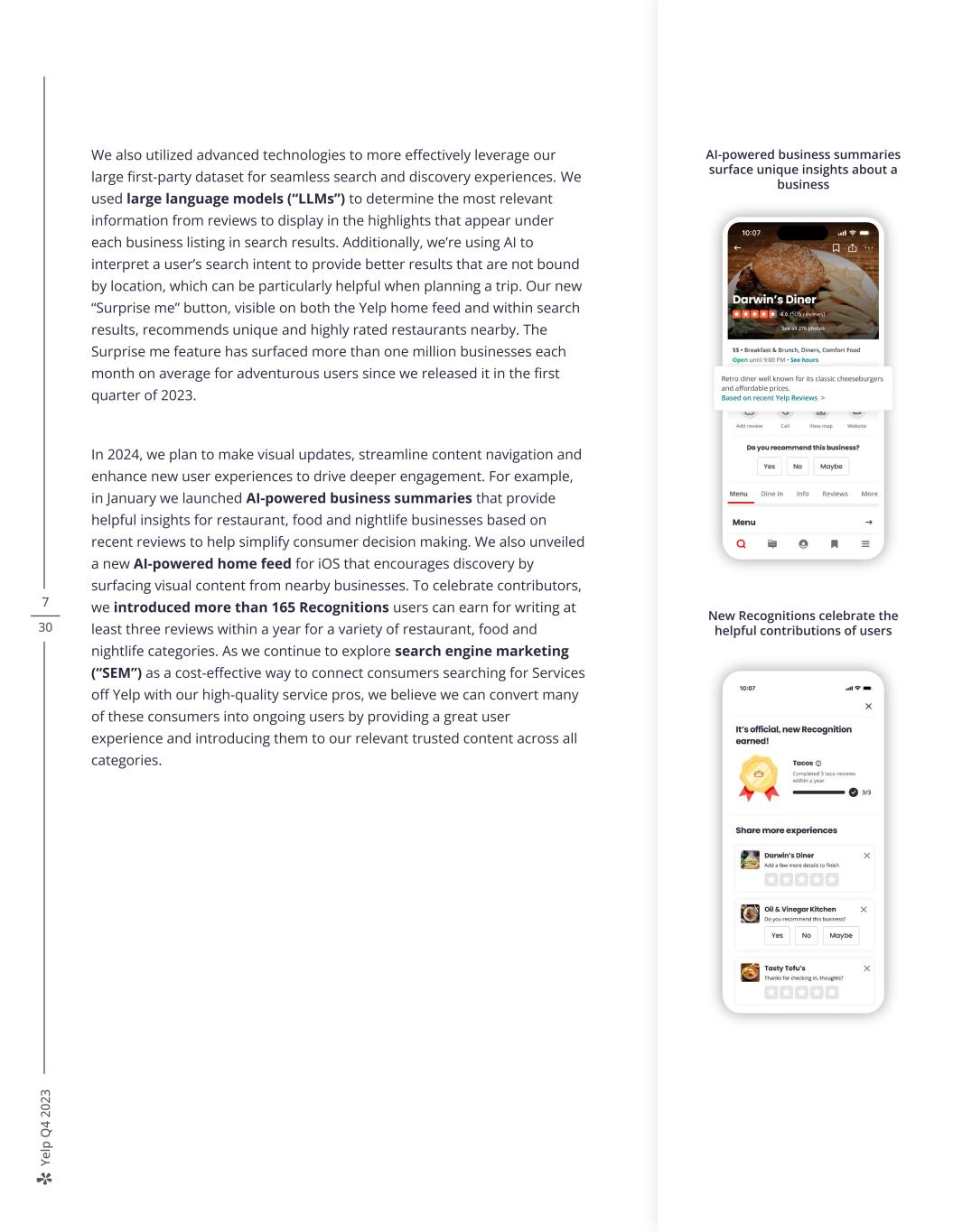 Ye lp Q 4 20 23 7 30 We also utilized advanced technologies to more effectively leverage our large first-party dataset for seamless search and discovery experiences. We used large language models (“LLMs”) to determine the most relevant information from reviews to display in the highlights that appear under each business listing in search results. Additionally, we’re using AI to interpret a user’s search intent to provide better results that are not bound by location, which can be particularly helpful when planning a trip. Our new “Surprise me” button, visible on both the Yelp home feed and within search results, recommends unique and highly rated restaurants nearby. The Surprise me feature has surfaced more than one million businesses each month on average for adventurous users since we released it in the first quarter of 2023. In 2024, we plan to make visual updates, streamline content navigation and enhance new user experiences to drive deeper engagement. For example, in January we launched AI-powered business summaries that provide helpful insights for restaurant, food and nightlife businesses based on recent reviews to help simplify consumer decision making. We also unveiled a new AI-powered home feed for iOS that encourages discovery by surfacing visual content from nearby businesses. To celebrate contributors, we introduced more than 165 Recognitions users can earn for writing at least three reviews within a year for a variety of restaurant, food and nightlife categories. As we continue to explore search engine marketing (“SEM”) as a cost-effective way to connect consumers searching for Services off Yelp with our high-quality service pros, we believe we can convert many of these consumers into ongoing users by providing a great user experience and introducing them to our relevant trusted content across all categories. ~20% 3Q22 3Q23 +14% Local, Auto, Professional, Pets, Real Estate, Financial and Event Services Home Services Services growth led by Home Services Services Revenue AI-powered business summaries surface unique insights about a business New Recognitions celebrate the helpful contributions of users