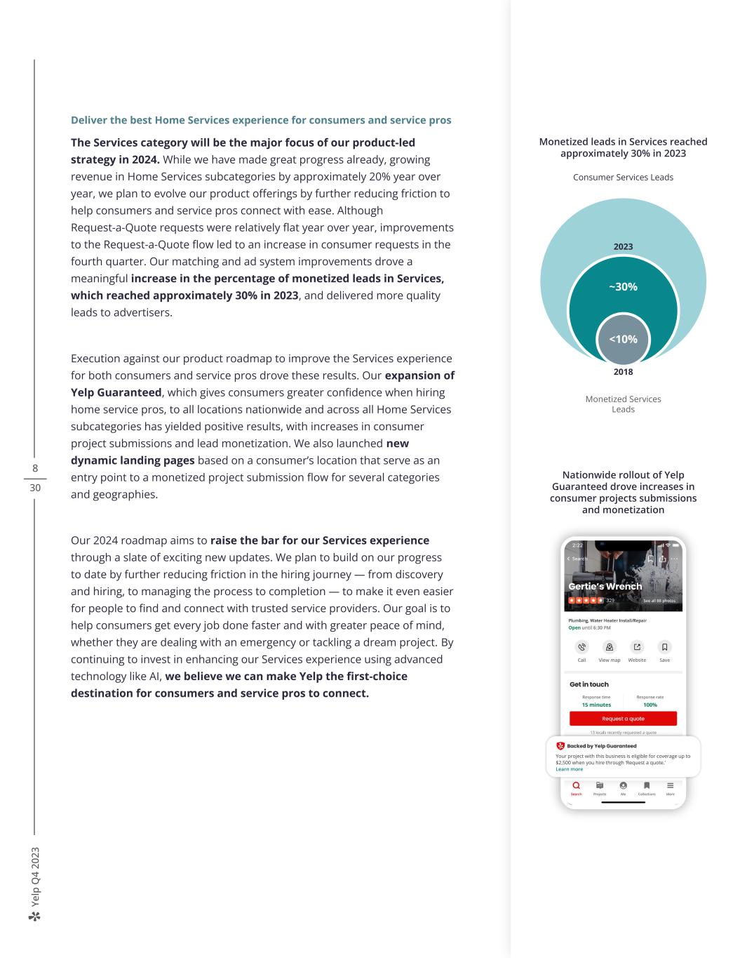 Ye lp Q 4 20 23 8 30 Deliver the best Home Services experience for consumers and service pros The Services category will be the major focus of our product-led strategy in 2024. While we have made great progress already, growing revenue in Home Services subcategories by approximately 20% year over year, we plan to evolve our product offerings by further reducing friction to help consumers and service pros connect with ease. Although Request-a-Quote requests were relatively flat year over year, improvements to the Request-a-Quote flow led to an increase in consumer requests in the fourth quarter. Our matching and ad system improvements drove a meaningful increase in the percentage of monetized leads in Services, which reached approximately 30% in 2023, and delivered more quality leads to advertisers. Execution against our product roadmap to improve the Services experience for both consumers and service pros drove these results. Our expansion of Yelp Guaranteed, which gives consumers greater confidence when hiring home service pros, to all locations nationwide and across all Home Services subcategories has yielded positive results, with increases in consumer project submissions and lead monetization. We also launched new dynamic landing pages based on a consumer’s location that serve as an entry point to a monetized project submission flow for several categories and geographies. Our 2024 roadmap aims to raise the bar for our Services experience through a slate of exciting new updates. We plan to build on our progress to date by further reducing friction in the hiring journey — from discovery and hiring, to managing the process to completion — to make it even easier for people to find and connect with trusted service providers. Our goal is to help consumers get every job done faster and with greater peace of mind, whether they are dealing with an emergency or tackling a dream project. By continuing to invest in enhancing our Services experience using advanced technology like AI, we believe we can make Yelp the first-choice destination for consumers and service pros to connect. 2018 Monetized Services Leads ~30% 2023 <10% Nationwide rollout of Yelp Guaranteed drove increases in consumer projects submissions and monetization Monetized leads in Services reached approximately 30% in 2023 Consumer Services Leads
