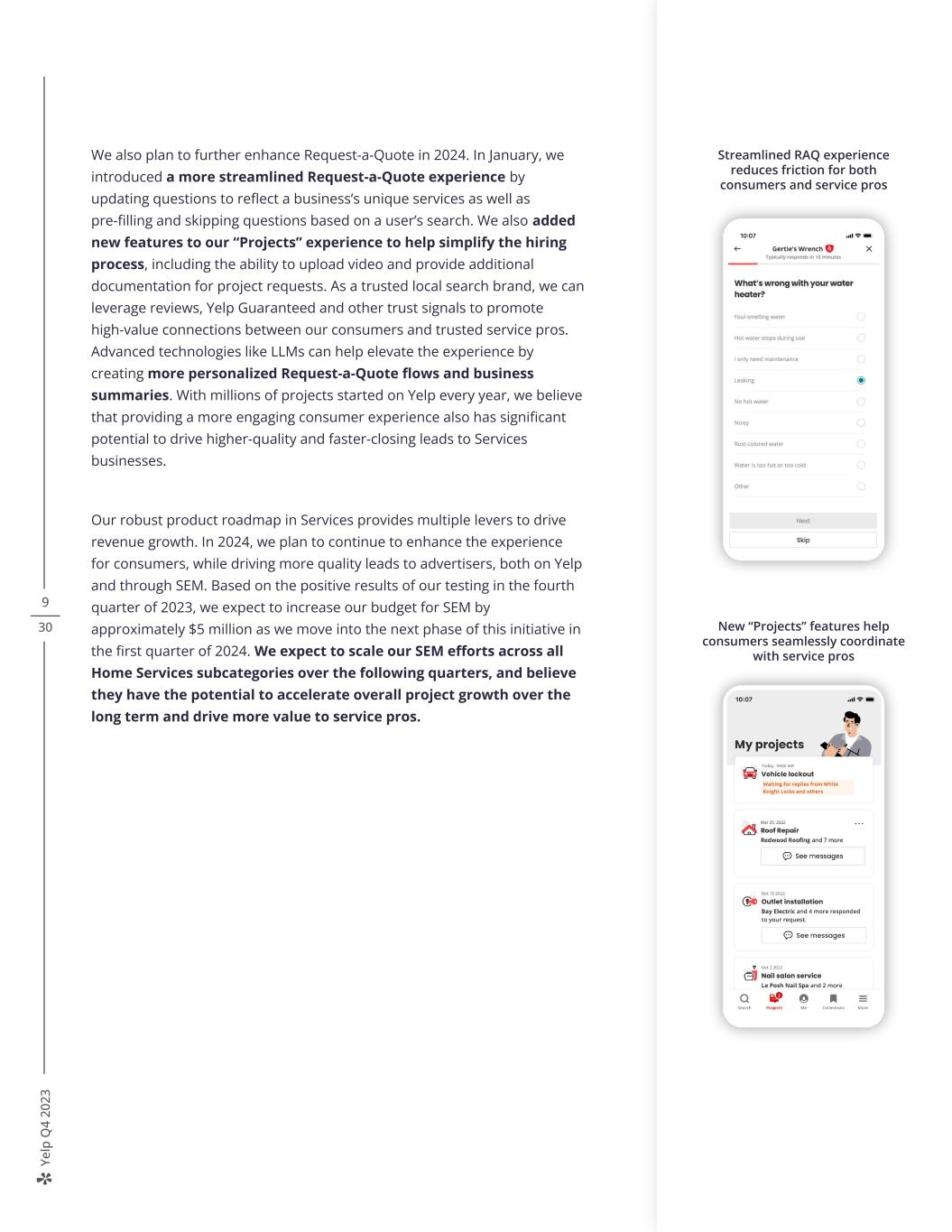 Ye lp Q 4 20 23 9 30 We also plan to further enhance Request-a-Quote in 2024. In January, we introduced a more streamlined Request-a-Quote experience by updating questions to reflect a business’s unique services as well as pre-filling and skipping questions based on a user’s search. We also added new features to our “Projects” experience to help simplify the hiring process, including the ability to upload video and provide additional documentation for project requests. As a trusted local search brand, we can leverage reviews, Yelp Guaranteed and other trust signals to promote high-value connections between our consumers and trusted service pros. Advanced technologies like LLMs can help elevate the experience by creating more personalized Request-a-Quote flows and business summaries. With millions of projects started on Yelp every year, we believe that providing a more engaging consumer experience also has significant potential to drive higher-quality and faster-closing leads to Services businesses. Our robust product roadmap in Services provides multiple levers to drive revenue growth. In 2024, we plan to continue to enhance the experience for consumers, while driving more quality leads to advertisers, both on Yelp and through SEM. Based on the positive results of our testing in the fourth quarter of 2023, we expect to increase our budget for SEM by approximately $5 million as we move into the next phase of this initiative in the first quarter of 2024. We expect to scale our SEM efforts across all Home Services subcategories over the following quarters, and believe they have the potential to accelerate overall project growth over the long term and drive more value to service pros. New “Projects” features help consumers seamlessly coordinate with service pros Streamlined RAQ experience reduces friction for both consumers and service pros