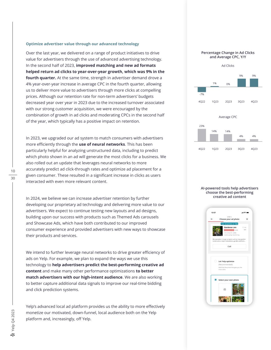 Ye lp Q 4 20 23 10 30 Optimize advertiser value through our advanced technology Over the last year, we delivered on a range of product initiatives to drive value for advertisers through the use of advanced advertising technology. In the second half of 2023, improved matching and new ad formats helped return ad clicks to year-over-year growth, which was 9% in the fourth quarter. At the same time, strength in advertiser demand drove a 4% year-over-year increase in average CPC in the fourth quarter, allowing us to deliver more value to advertisers through more clicks at compelling prices. Although our retention rate for non-term advertisers’ budgets decreased year over year in 2023 due to the increased turnover associated with our strong customer acquisition, we were encouraged by the combination of growth in ad clicks and moderating CPCs in the second half of the year, which typically has a positive impact on retention. In 2023, we upgraded our ad system to match consumers with advertisers more efficiently through the use of neural networks. This has been particularly helpful for analyzing unstructured data, including to predict which photo shown in an ad will generate the most clicks for a business. We also rolled out an update that leverages neural networks to more accurately predict ad click-through rates and optimize ad placement for a given consumer. These resulted in a significant increase in clicks as users interacted with even more relevant content. In 2024, we believe we can increase advertiser retention by further developing our proprietary ad technology and delivering more value to our advertisers. We expect to continue testing new layouts and ad designs, building upon our success with products such as Themed Ads carousels and Showcase Ads, which have both contributed to our improved consumer experience and provided advertisers with new ways to showcase their products and services. We intend to further leverage neural networks to drive greater efficiency of ads on Yelp. For example, we plan to expand the ways we use this technology to help advertisers predict the best-performing creative ad content and make many other performance optimizations to better match advertisers with our high-intent audience. We are also working to better capture additional data signals to improve our real-time bidding and click prediction systems. Yelp’s advanced local ad platform provides us the ability to more effectively monetize our motivated, down-funnel, local audience both on the Yelp platform and, increasingly, off Yelp. 3Q20 3Q21 3Q22 3Q23 Self-serveLocal Multi-Loc Partner 30% 19% 49% 30% 21% 47% Most efficient channels accounted for 51% of ad revenue Ad Revenue by Channel, % of Total 51%28% 17% 52% 26% 14% 56% Service offering prompts Percentage Change in Ad Clicks and Average CPC, Y/Y Ad Clicks -7% 4Q22 1Q23 2Q23 3Q23 4Q23 9% 1% 0% 9% Average CPC 23% 4Q22 1Q23 2Q23 3Q23 4Q23 4% 14% 4% 14% AI-powered tools help advertisers choose the best-performing creative ad content Exhibit 9