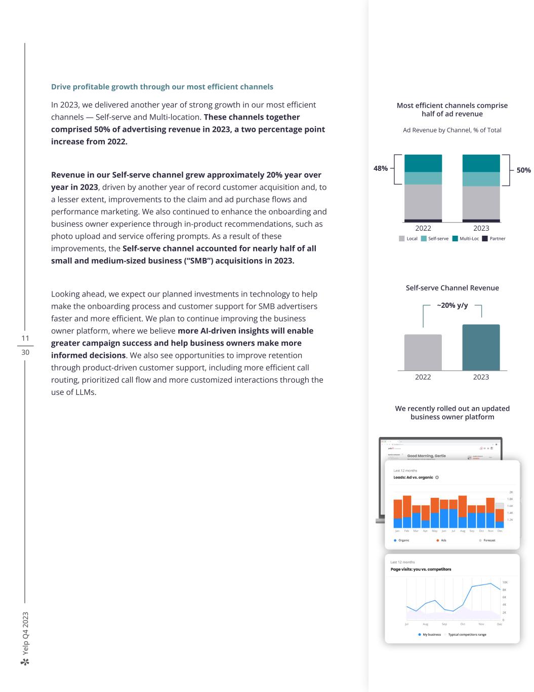 Ye lp Q 4 20 23 11 30 Drive profitable growth through our most efficient channels In 2023, we delivered another year of strong growth in our most efficient channels — Self-serve and Multi-location. These channels together comprised 50% of advertising revenue in 2023, a two percentage point increase from 2022. Revenue in our Self-serve channel grew approximately 20% year over year in 2023, driven by another year of record customer acquisition and, to a lesser extent, improvements to the claim and ad purchase flows and performance marketing. We also continued to enhance the onboarding and business owner experience through in-product recommendations, such as photo upload and service offering prompts. As a result of these improvements, the Self-serve channel accounted for nearly half of all small and medium-sized business (“SMB”) acquisitions in 2023. Looking ahead, we expect our planned investments in technology to help make the onboarding process and customer support for SMB advertisers faster and more efficient. We plan to continue improving the business owner platform, where we believe more AI-driven insights will enable greater campaign success and help business owners make more informed decisions. We also see opportunities to improve retention through product-driven customer support, including more efficient call routing, prioritized call flow and more customized interactions through the use of LLMs. 2022 2023 Self-serveLocal Multi-Loc Partner 28%48% 50% Most efficient channels comprise half of ad revenue Ad Revenue by Channel, % of Total Self-serve Channel Revenue ~20% y/y 2022 2023 We recently rolled out an updated business owner platform