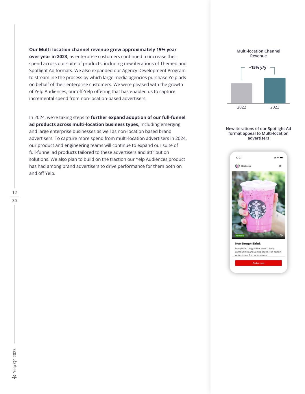 Ye lp Q 4 20 23 12 30 Our Multi-location channel revenue grew approximately 15% year over year in 2023, as enterprise customers continued to increase their spend across our suite of products, including new iterations of Themed and Spotlight Ad formats. We also expanded our Agency Development Program to streamline the process by which large media agencies purchase Yelp ads on behalf of their enterprise customers. We were pleased with the growth of Yelp Audiences, our off-Yelp offering that has enabled us to capture incremental spend from non-location-based advertisers. In 2024, we’re taking steps to further expand adoption of our full-funnel ad products across multi-location business types, including emerging and large enterprise businesses as well as non-location based brand advertisers. To capture more spend from multi-location advertisers in 2024, our product and engineering teams will continue to expand our suite of full-funnel ad products tailored to these advertisers and attribution solutions. We also plan to build on the traction our Yelp Audiences product has had among brand advertisers to drive performance for them both on and off Yelp. Multi-location Channel Revenue ~15% y/y 2022 2023 Exhibit 9 New iterations of our Spotlight Ad format appeal to Multi-location advertisers