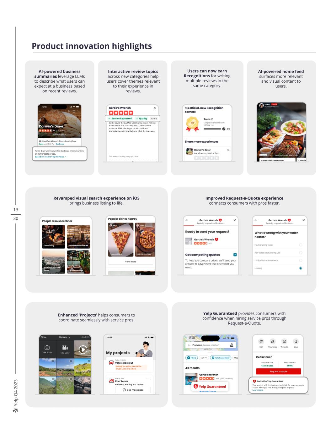 Ye lp Q 4 20 23 AI-powered home feed surfaces more relevant and visual content to users. Interactive review topics across new categories help users cover themes relevant to their experience in reviews. Yelp Guaranteed provides consumers with confidence when hiring service pros through Request-a-Quote. AI-powered business summaries leverage LLMs to describe what users can expect at a business based on recent reviews. Revamped visual search experience on iOS brings business listing to life. Users can now earn Recognitions for writing multiple reviews in the same category. Improved Request-a-Quote experience connects consumers with pros faster. Enhanced ‘Projects’ helps consumers to coordinate seamlessly with service pros. 30 13 Product innovation highlights Review highlights driven by LLMs make finding relevant businesses easier.