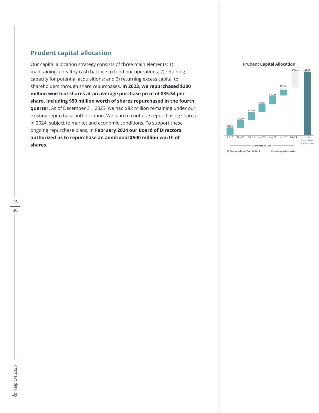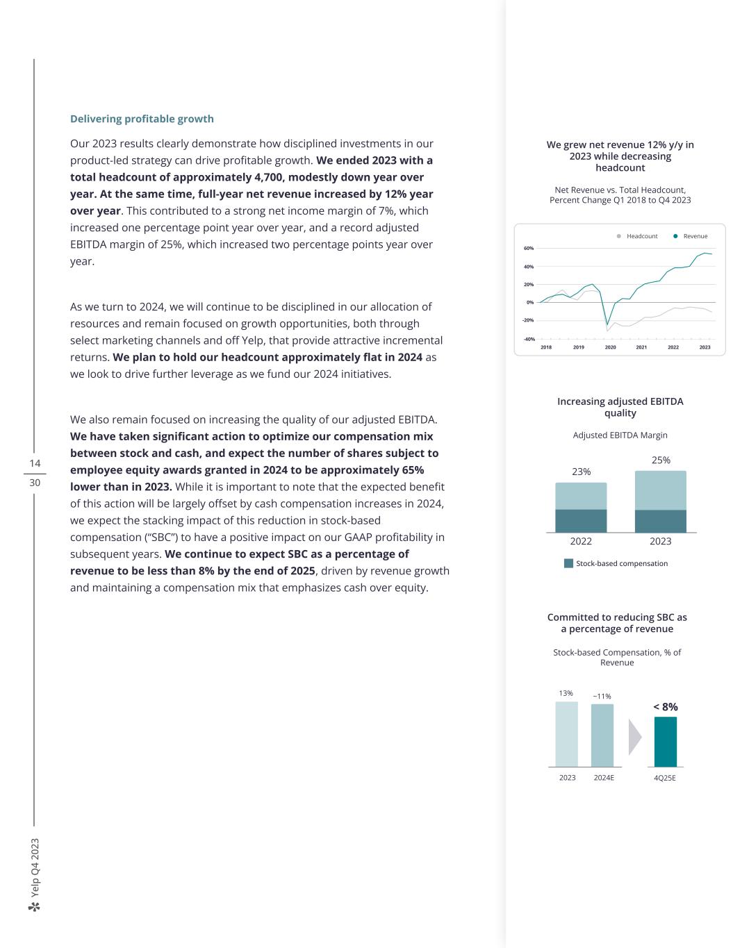 Ye lp Q 4 20 23 14 30 Delivering profitable growth Our 2023 results clearly demonstrate how disciplined investments in our product-led strategy can drive profitable growth. We ended 2023 with a total headcount of approximately 4,700, modestly down year over year. At the same time, full-year net revenue increased by 12% year over year. This contributed to a strong net income margin of 7%, which increased one percentage point year over year, and a record adjusted EBITDA margin of 25%, which increased two percentage points year over year. As we turn to 2024, we will continue to be disciplined in our allocation of resources and remain focused on growth opportunities, both through select marketing channels and off Yelp, that provide attractive incremental returns. We plan to hold our headcount approximately flat in 2024 as we look to drive further leverage as we fund our 2024 initiatives. We also remain focused on increasing the quality of our adjusted EBITDA. We have taken significant action to optimize our compensation mix between stock and cash, and expect the number of shares subject to employee equity awards granted in 2024 to be approximately 65% lower than in 2023. While it is important to note that the expected benefit of this action will be largely offset by cash compensation increases in 2024, we expect the stacking impact of this reduction in stock-based compensation (“SBC”) to have a positive impact on our GAAP profitability in subsequent years. We continue to expect SBC as a percentage of revenue to be less than 8% by the end of 2025, driven by revenue growth and maintaining a compensation mix that emphasizes cash over equity. 2022 2023 Stock-based compensation 23% 25% Increasing adjusted EBITDA quality Adjusted EBITDA Margin Committed to reducing SBC as a percentage of revenue Stock-based Compensation, % of Revenue 13% ~11% < 8% 2023 2024E 4Q25E RevenueHeadcount 2023 60% 2018 2019 2020 2021 2022 40% 20% 0% -20% -40% We grew net revenue 12% y/y in 2023 while decreasing headcount Net Revenue vs. Total Headcount, Percent Change Q1 2018 to Q4 2023