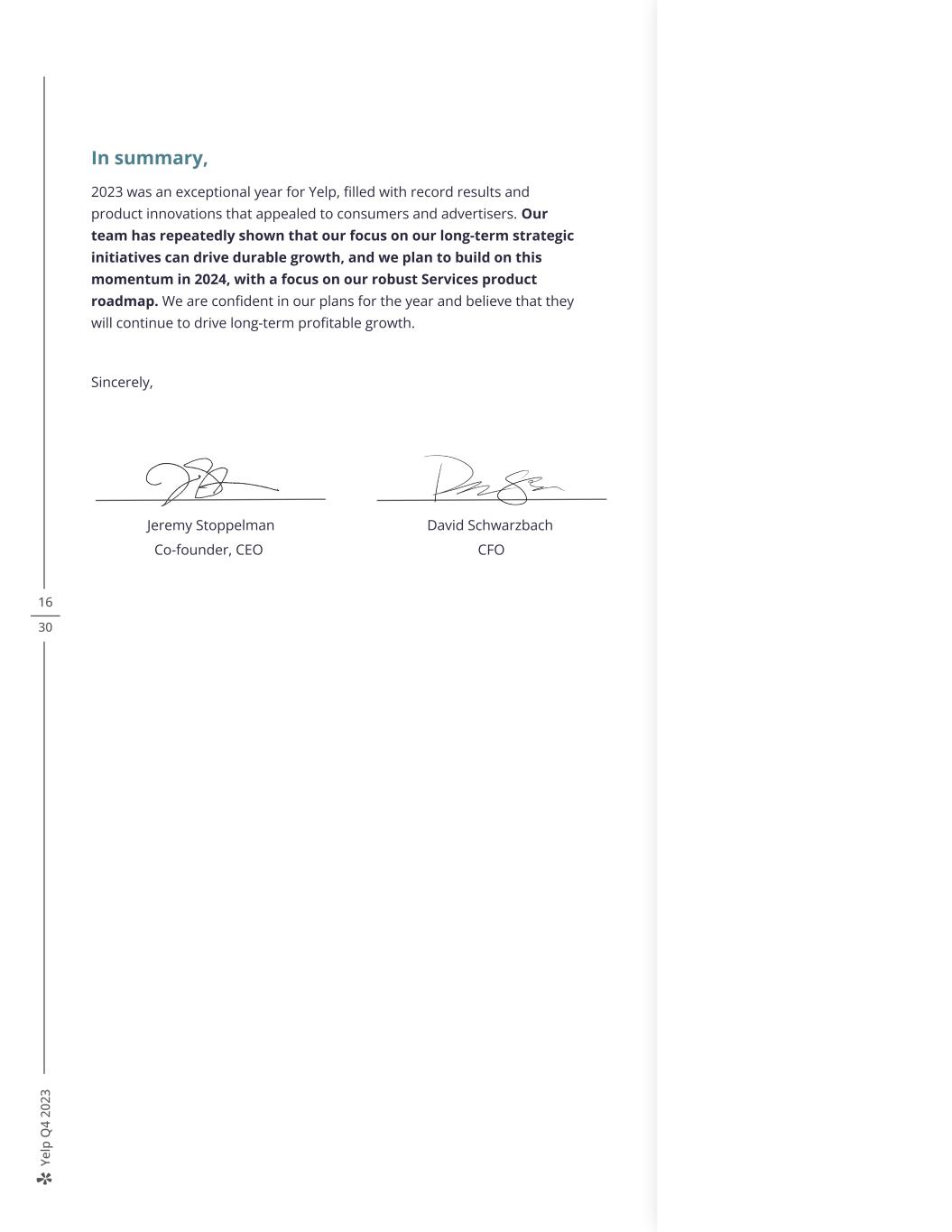 Ye lp Q 4 20 23 In summary, 2023 was an exceptional year for Yelp, filled with record results and product innovations that appealed to consumers and advertisers. Our team has repeatedly shown that our focus on our long-term strategic initiatives can drive durable growth, and we plan to build on this momentum in 2024, with a focus on our robust Services product roadmap. We are confident in our plans for the year and believe that they will continue to drive long-term profitable growth. Sincerely, Jeremy Stoppelman David Schwarzbach Co-founder, CEO CFO 16 30