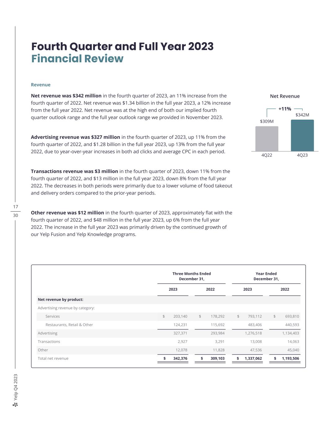 Ye lp Q 4 20 23 17 30 Revenue Net revenue was $342 million in the fourth quarter of 2023, an 11% increase from the fourth quarter of 2022. Net revenue was $1.34 billion in the full year 2023, a 12% increase from the full year 2022. Net revenue was at the high end of both our implied fourth quarter outlook range and the full year outlook range we provided in November 2023. Advertising revenue was $327 million in the fourth quarter of 2023, up 11% from the fourth quarter of 2022, and $1.28 billion in the full year 2023, up 13% from the full year 2022, due to year-over-year increases in both ad clicks and average CPC in each period. Transactions revenue was $3 million in the fourth quarter of 2023, down 11% from the fourth quarter of 2022, and $13 million in the full year 2023, down 8% from the full year 2022. The decreases in both periods were primarily due to a lower volume of food takeout and delivery orders compared to the prior-year periods. Other revenue was $12 million in the fourth quarter of 2023, approximately flat with the fourth quarter of 2022, and $48 million in the full year 2023, up 6% from the full year 2022. The increase in the full year 2023 was primarily driven by the continued growth of our Yelp Fusion and Yelp Knowledge programs. Fourth Quarter and Full Year 2023 Financial Review Three Months Ended December 31, Year Ended December 31, 2023 2022 2023 2022 Net revenue by product: Advertising revenue by category: Services $ 203,140 $ 178,292 $ 793,112 $ 693,810 Restaurants, Retail & Other 124,231 115,692 483,406 440,593 Advertising 327,371 293,984 1,276,518 1,134,403 Transactions 2,927 3,291 13,008 14,063 Other 12,078 11,828 47,536 45,040 Total net revenue $ 342,376 $ 309,103 $ 1,337,062 $ 1,193,506 Net Revenue +11% $309M $342M 4Q22 4Q23