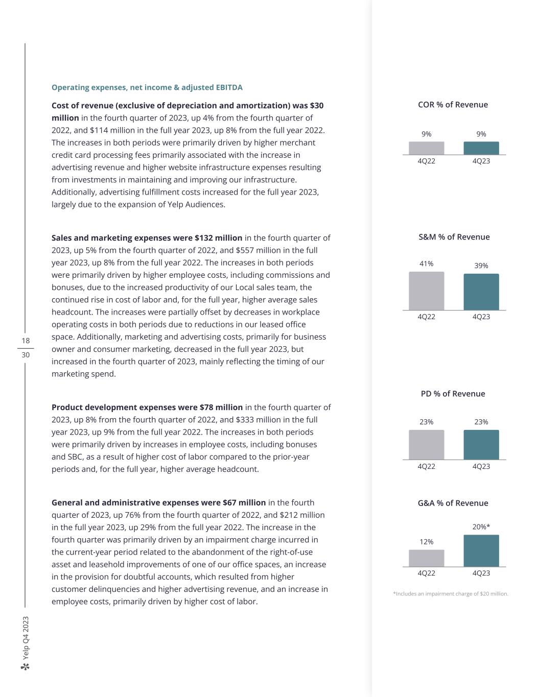 Ye lp Q 4 20 23 18 30 Operating expenses, net income & adjusted EBITDA Cost of revenue (exclusive of depreciation and amortization) was $30 million in the fourth quarter of 2023, up 4% from the fourth quarter of 2022, and $114 million in the full year 2023, up 8% from the full year 2022. The increases in both periods were primarily driven by higher merchant credit card processing fees primarily associated with the increase in advertising revenue and higher website infrastructure expenses resulting from investments in maintaining and improving our infrastructure. Additionally, advertising fulfillment costs increased for the full year 2023, largely due to the expansion of Yelp Audiences. Sales and marketing expenses were $132 million in the fourth quarter of 2023, up 5% from the fourth quarter of 2022, and $557 million in the full year 2023, up 8% from the full year 2022. The increases in both periods were primarily driven by higher employee costs, including commissions and bonuses, due to the increased productivity of our Local sales team, the continued rise in cost of labor and, for the full year, higher average sales headcount. The increases were partially offset by decreases in workplace operating costs in both periods due to reductions in our leased office space. Additionally, marketing and advertising costs, primarily for business owner and consumer marketing, decreased in the full year 2023, but increased in the fourth quarter of 2023, mainly reflecting the timing of our marketing spend. Product development expenses were $78 million in the fourth quarter of 2023, up 8% from the fourth quarter of 2022, and $333 million in the full year 2023, up 9% from the full year 2022. The increases in both periods were primarily driven by increases in employee costs, including bonuses and SBC, as a result of higher cost of labor compared to the prior-year periods and, for the full year, higher average headcount. General and administrative expenses were $67 million in the fourth quarter of 2023, up 76% from the fourth quarter of 2022, and $212 million in the full year 2023, up 29% from the full year 2022. The increase in the fourth quarter was primarily driven by an impairment charge incurred in the current-year period related to the abandonment of the right-of-use asset and leasehold improvements of one of our office spaces, an increase in the provision for doubtful accounts, which resulted from higher customer delinquencies and higher advertising revenue, and an increase in employee costs, primarily driven by higher cost of labor. COR % of Revenue 9% 9% 4Q22 4Q23 S&M % of Revenue 41% 39% 4Q22 4Q23 PD % of Revenue 23% 23% 4Q22 4Q23 G&A % of Revenue 12% 20%* 4Q22 4Q23 *Includes an impairment charge of $20 million.