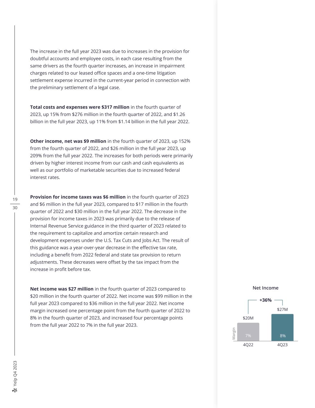 Ye lp Q 4 20 23 19 30 The increase in the full year 2023 was due to increases in the provision for doubtful accounts and employee costs, in each case resulting from the same drivers as the fourth quarter increases, an increase in impairment charges related to our leased office spaces and a one-time litigation settlement expense incurred in the current-year period in connection with the preliminary settlement of a legal case. Total costs and expenses were $317 million in the fourth quarter of 2023, up 15% from $276 million in the fourth quarter of 2022, and $1.26 billion in the full year 2023, up 11% from $1.14 billion in the full year 2022. Other income, net was $9 million in the fourth quarter of 2023, up 152% from the fourth quarter of 2022, and $26 million in the full year 2023, up 209% from the full year 2022. The increases for both periods were primarily driven by higher interest income from our cash and cash equivalents as well as our portfolio of marketable securities due to increased federal interest rates. Provision for income taxes was $6 million in the fourth quarter of 2023 and $6 million in the full year 2023, compared to $17 million in the fourth quarter of 2022 and $30 million in the full year 2022. The decrease in the provision for income taxes in 2023 was primarily due to the release of Internal Revenue Service guidance in the third quarter of 2023 related to the requirement to capitalize and amortize certain research and development expenses under the U.S. Tax Cuts and Jobs Act. The result of this guidance was a year-over-year decrease in the effective tax rate, including a benefit from 2022 federal and state tax provision to return adjustments. These decreases were offset by the tax impact from the increase in profit before tax. Net income was $27 million in the fourth quarter of 2023 compared to $20 million in the fourth quarter of 2022. Net income was $99 million in the full year 2023 compared to $36 million in the full year 2022. Net income margin increased one percentage point from the fourth quarter of 2022 to 8% in the fourth quarter of 2023, and increased four percentage points from the full year 2022 to 7% in the full year 2023. 19% 17% 19% 17% 8% 7% M ar gi n Net Income +36% $20M $27M 4Q22 4Q23 87