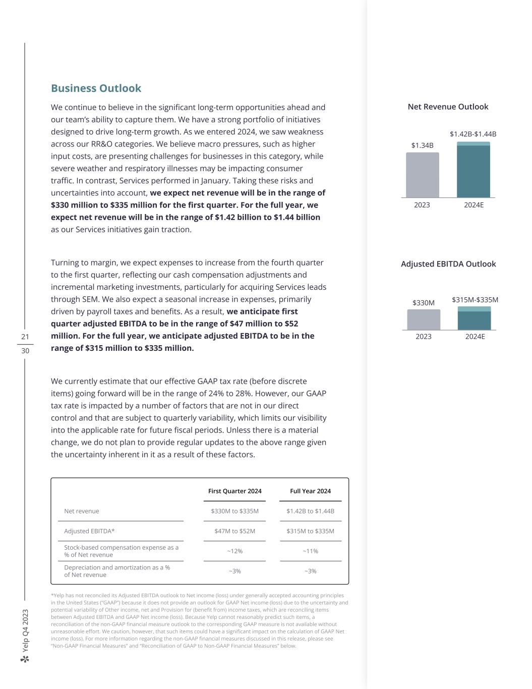 Ye lp Q 4 20 23 21 30 Business Outlook We continue to believe in the significant long-term opportunities ahead and our team’s ability to capture them. We have a strong portfolio of initiatives designed to drive long-term growth. As we entered 2024, we saw weakness across our RR&O categories. We believe macro pressures, such as higher input costs, are presenting challenges for businesses in this category, while severe weather and respiratory illnesses may be impacting consumer traffic. In contrast, Services performed in January. Taking these risks and uncertainties into account, we expect net revenue will be in the range of $330 million to $335 million for the first quarter. For the full year, we expect net revenue will be in the range of $1.42 billion to $1.44 billion as our Services initiatives gain traction. Turning to margin, we expect expenses to increase from the fourth quarter to the first quarter, reflecting our cash compensation adjustments and incremental marketing investments, particularly for acquiring Services leads through SEM. We also expect a seasonal increase in expenses, primarily driven by payroll taxes and benefits. As a result, we anticipate first quarter adjusted EBITDA to be in the range of $47 million to $52 million. For the full year, we anticipate adjusted EBITDA to be in the range of $315 million to $335 million. We currently estimate that our effective GAAP tax rate (before discrete items) going forward will be in the range of 24% to 28%. However, our GAAP tax rate is impacted by a number of factors that are not in our direct control and that are subject to quarterly variability, which limits our visibility into the applicable rate for future fiscal periods. Unless there is a material change, we do not plan to provide regular updates to the above range given the uncertainty inherent in it as a result of these factors. $330M Adjusted EBITDA Outlook 2023 2024E $315M-$335M *Yelp has not reconciled its Adjusted EBITDA outlook to Net income (loss) under generally accepted accounting principles in the United States (“GAAP”) because it does not provide an outlook for GAAP Net income (loss) due to the uncertainty and potential variability of Other income, net and Provision for (benefit from) income taxes, which are reconciling items between Adjusted EBITDA and GAAP Net income (loss). Because Yelp cannot reasonably predict such items, a reconciliation of the non-GAAP financial measure outlook to the corresponding GAAP measure is not available without unreasonable effort. We caution, however, that such items could have a significant impact on the calculation of GAAP Net income (loss). For more information regarding the non-GAAP financial measures discussed in this release, please see “Non-GAAP Financial Measures” and “Reconciliation of GAAP to Non-GAAP Financial Measures” below. 2023 2024E $1.34B $1.42B-$1.44B Net Revenue Outlook First Quarter 2024 Full Year 2024 Net revenue $330M to $335M $1.42B to $1.44B Adjusted EBITDA* $47M to $52M $315M to $335M Stock-based compensation expense as a % of Net revenue ~12% ~11% Depreciation and amortization as a % of Net revenue ~3% ~3%