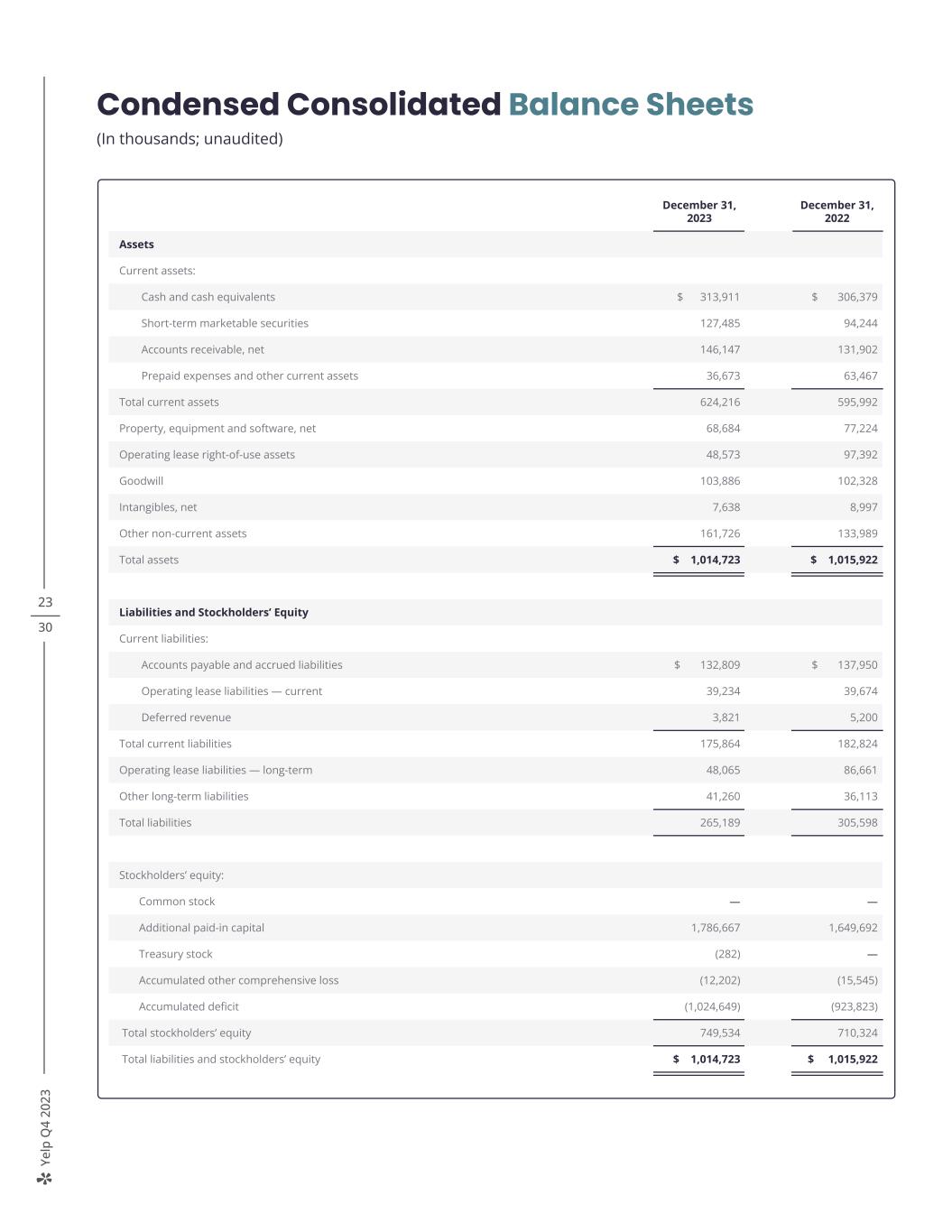 Ye lp Q 4 20 23 23 30 Condensed Consolidated Balance Sheets (In thousands; unaudited) December 31, 2023 December 31, 2022 Assets Current assets: Cash and cash equivalents $ 313,911 $ 306,379 Short-term marketable securities 127,485 94,244 Accounts receivable, net 146,147 131,902 Prepaid expenses and other current assets 36,673 63,467 Total current assets 624,216 595,992 Property, equipment and software, net 68,684 77,224 Operating lease right-of-use assets 48,573 97,392 Goodwill 103,886 102,328 Intangibles, net 7,638 8,997 Other non-current assets 161,726 133,989 Total assets $ 1,014,723 $ 1,015,922 Liabilities and Stockholders’ Equity Current liabilities: Accounts payable and accrued liabilities $ 132,809 $ 137,950 Operating lease liabilities — current 39,234 39,674 Deferred revenue 3,821 5,200 Total current liabilities 175,864 182,824 Operating lease liabilities — long-term 48,065 86,661 Other long-term liabilities 41,260 36,113 Total liabilities 265,189 305,598 Stockholders’ equity: Common stock — — Additional paid-in capital 1,786,667 1,649,692 Treasury stock (282) — Accumulated other comprehensive loss (12,202) (15,545) Accumulated deficit (1,024,649) (923,823) Total stockholders’ equity 749,534 710,324 Total liabilities and stockholders’ equity $ 1,014,723 $ 1,015,922