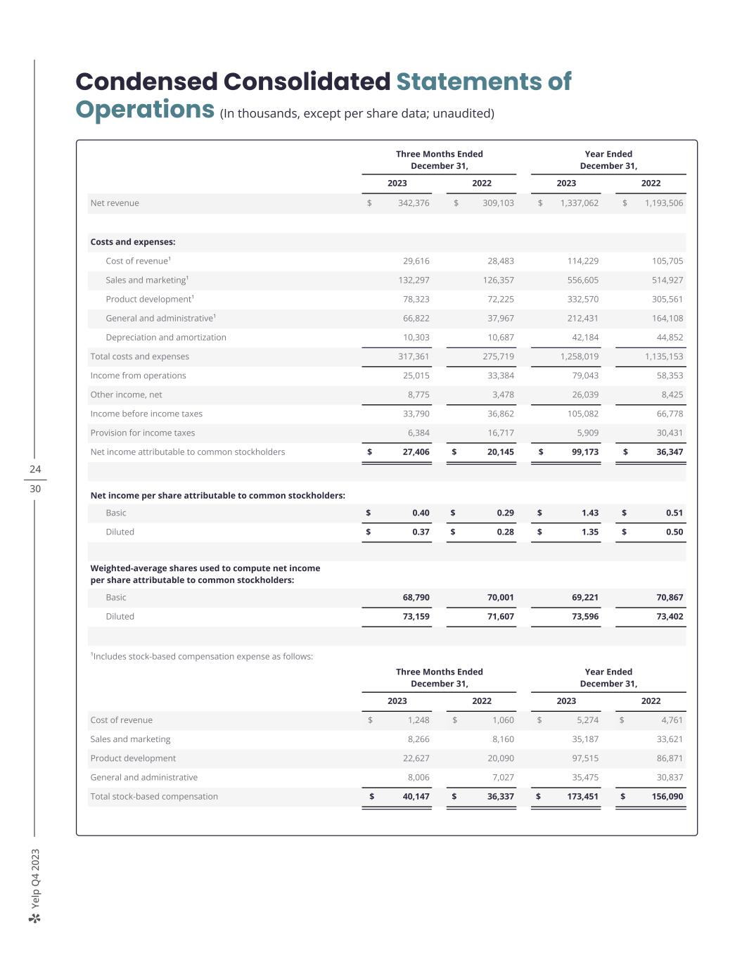 Ye lp Q 4 20 23 24 30 Condensed Consolidated Statements of Operations (In thousands, except per share data; unaudited) Three Months Ended December 31, Year Ended December 31, 2023 2022 2023 2022 Net revenue $ 342,376 $ 309,103 $ 1,337,062 $ 1,193,506 Costs and expenses: Cost of revenue¹ 29,616 28,483 114,229 105,705 Sales and marketing¹ 132,297 126,357 556,605 514,927 Product development¹ 78,323 72,225 332,570 305,561 General and administrative¹ 66,822 37,967 212,431 164,108 Depreciation and amortization 10,303 10,687 42,184 44,852 Total costs and expenses 317,361 275,719 1,258,019 1,135,153 Income from operations 25,015 33,384 79,043 58,353 Other income, net 8,775 3,478 26,039 8,425 Income before income taxes 33,790 36,862 105,082 66,778 Provision for income taxes 6,384 16,717 5,909 30,431 Net income attributable to common stockholders $ 27,406 $ 20,145 $ 99,173 $ 36,347 Net income per share attributable to common stockholders: Basic $ 0.40 $ 0.29 $ 1.43 $ 0.51 Diluted $ 0.37 $ 0.28 $ 1.35 $ 0.50 Weighted-average shares used to compute net income per share attributable to common stockholders: Basic 68,790 70,001 69,221 70,867 Diluted 73,159 71,607 73,596 73,402 ¹Includes stock-based compensation expense as follows: Three Months Ended December 31, Year Ended December 31, 2023 2022 2023 2022 Cost of revenue $ 1,248 $ 1,060 $ 5,274 $ 4,761 Sales and marketing 8,266 8,160 35,187 33,621 Product development 22,627 20,090 97,515 86,871 General and administrative 8,006 7,027 35,475 30,837 Total stock-based compensation $ 40,147 $ 36,337 $ 173,451 $ 156,090