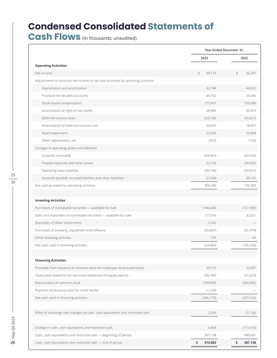 Ye lp Q 4 20 23 25 30 Condensed Consolidated Statements of Cash Flows (In thousands; unaudited) Year Ended December 31, 2023 2022 Operating Activities Net income $ 99,173 $ 36,347 Adjustments to reconcile net income to net cash provided by operating activities: Depreciation and amortization 42,184 44,852 Provision for doubtful accounts 40,702 25,006 Stock-based compensation 173,451 156,090 Amortization of right-of-use assets 28,084 32,810 Deferred income taxes (22,150) (56,621) Amortization of deferred contract cost 24,035 18,827 Asset impairment 23,563 10,464 Other adjustments, net (410) 1,036 Changes in operating assets and liabilities: Accounts receivable (54,947) (49,555) Prepaid expenses and other assets (5,123) (36,032) Operating lease liabilities (39,734) (40,057) Accounts payable, accrued liabilities and other liabilities (2,548) 49,142 Net cash provided by operating activities 306,280 192,309 Investing Activities Purchases of marketable securities — available-for-sale (148,448) (127,080) Sales and maturities of marketable securities — available-for-sale 117,916 32,821 Maturities of other investments 2,500 — Purchases of property, equipment and software (26,847) (31,979) Other investing activities 195 94 Net cash used in investing activities (54,684) (126,144) Financing Activities Proceeds from issuance of common stock for employee stock-based plans 39,510 23,497 Taxes paid related to the net share settlement of equity awards (85,180) (61,023) Repurchases of common stock (199,999) (200,006) Payment of issuance costs for credit facility (1,109) — Net cash used in financing activities (246,778) (237,532) Effect of exchange rate changes on cash, cash equivalents and restricted cash 2,046 (2,136) Change in cash, cash equivalents and restricted cash 6,864 (173,503) Cash, cash equivalents and restricted cash — Beginning of period 307,138 480,641 Cash, cash equivalents and restricted cash — End of period $ 314,002 $ 307,138