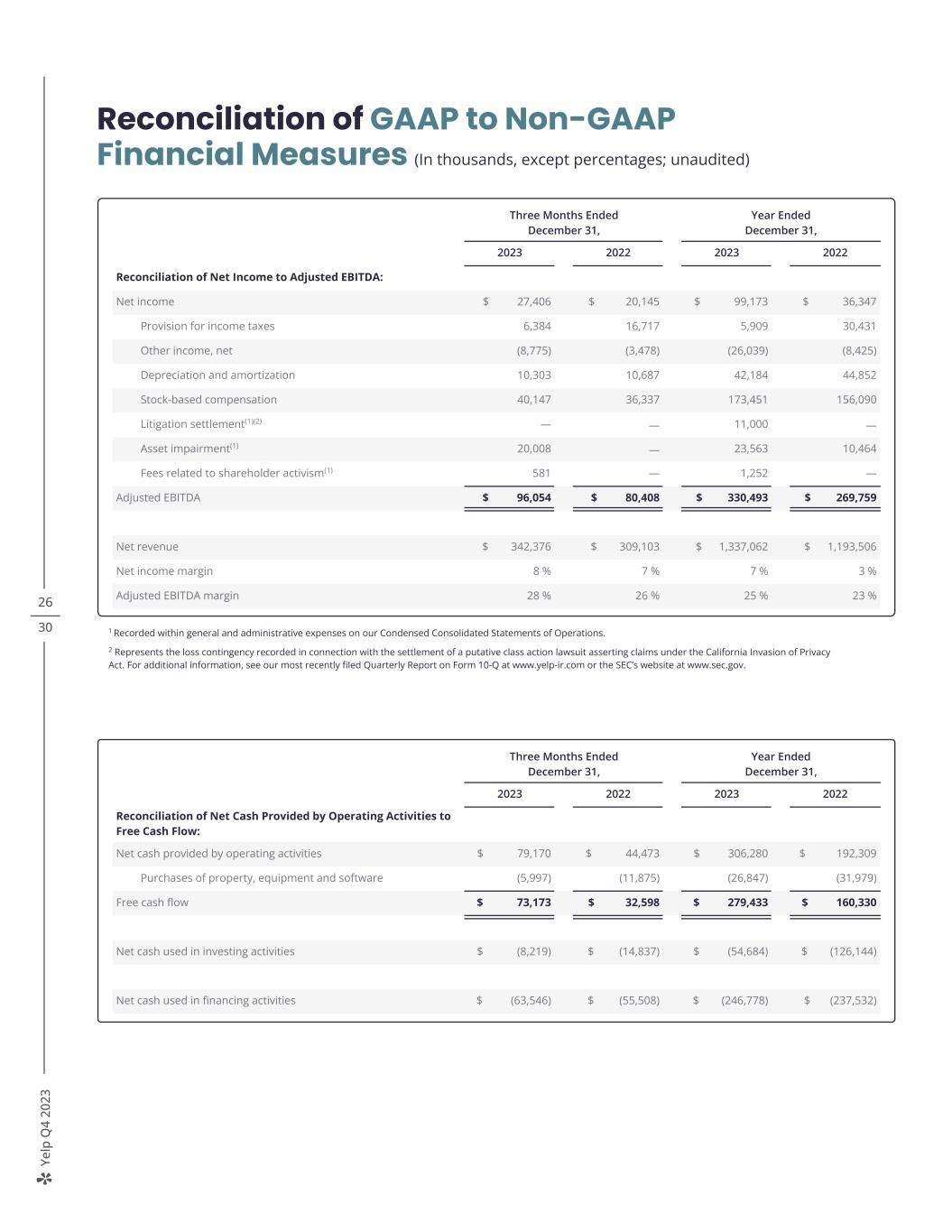 Ye lp Q 4 20 23 26 30 Reconciliation of GAAP to Non-GAAP Financial Measures (In thousands, except percentages; unaudited) 1 Recorded within general and administrative expenses on our Condensed Consolidated Statements of Operations. 2 Represents the loss contingency recorded in connection with the settlement of a putative class action lawsuit asserting claims under the California Invasion of Privacy Act. For additional information, see our most recently filed Quarterly Report on Form 10-Q at www.yelp-ir.com or the SEC’s website at www.sec.gov. Three Months Ended December 31, Year Ended December 31, 2023 2022 2023 2022 Reconciliation of Net Income to Adjusted EBITDA: Net income $ 27,406 $ 20,145 $ 99,173 $ 36,347 Provision for income taxes 6,384 16,717 5,909 30,431 Other income, net (8,775) (3,478) (26,039) (8,425) Depreciation and amortization 10,303 10,687 42,184 44,852 Stock-based compensation 40,147 36,337 173,451 156,090 Litigation settlement(1)(2) — — 11,000 — Asset impairment(1) 20,008 — 23,563 10,464 Fees related to shareholder activism(1) 581 — 1,252 — Adjusted EBITDA $ 96,054 $ 80,408 $ 330,493 $ 269,759 Net revenue $ 342,376 $ 309,103 $ 1,337,062 $ 1,193,506 Net income margin 8 % 7 % 7 % 3 % Adjusted EBITDA margin 28 % 26 % 25 % 23 % Three Months Ended December 31, Year Ended December 31, 2023 2022 2023 2022 Reconciliation of Net Cash Provided by Operating Activities to Free Cash Flow: Net cash provided by operating activities $ 79,170 $ 44,473 $ 306,280 $ 192,309 Purchases of property, equipment and software (5,997) (11,875) (26,847) (31,979) Free cash flow $ 73,173 $ 32,598 $ 279,433 $ 160,330 Net cash used in investing activities $ (8,219) $ (14,837) $ (54,684) $ (126,144) Net cash used in financing activities $ (63,546) $ (55,508) $ (246,778) $ (237,532)